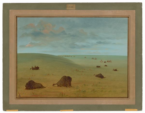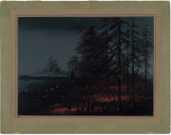Editor: Here we have George Catlin's "A Sioux War Party," dating from sometime in the 1860s. It's a watercolor showing figures in a landscape at twilight, a rather Romantic image, though I'm immediately aware of the fraught history behind images of the American West. What jumps out at you? Curator: It's important to consider the power dynamics at play in Catlin's work. How does his perspective as a white artist influence the portrayal of the Sioux people and their "war party?" It's vital to critically examine whether this image reinforces colonial narratives, especially considering the historical context of westward expansion and the displacement of Indigenous populations. Editor: That makes sense. I hadn't thought about the title itself and its implications. Curator: Exactly. What does "war party" even mean in this context? Whose definition are we accepting? Are we considering the potential for resistance against U.S. government policies or the protection of sacred land? Can we interpret the gathering not merely as aggression, but perhaps as an act of defiance and a fight for self-determination in the face of cultural erasure? Editor: So it is less about the image itself, and more about whose story it’s telling—and whose it silences? Curator: Precisely. The artwork, in that case, is a lens through which we explore a critical dialogue of its historical context. Whose perspective shapes the narrative? By interrogating these aspects, we engage in decolonizing art history. Editor: I’m definitely going to look at other images from the time period differently now, knowing what kind of questions to ask. Curator: Great. That is precisely the point: To create a framework for critical thought.