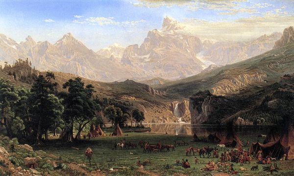 Editor: Albert Bierstadt’s "The Rocky Mountains, Lander's Peak," painted in 1863 with oil on canvas. It is so majestic and serene. How should we understand this work in its broader context? Curator: Let’s think about it as more than just a pretty picture. Look at how the Indigenous people are depicted in relation to the vast landscape. Does it feel balanced, or does one dominate? Editor: They do seem somewhat small compared to the towering mountains. Curator: Exactly. Think about the historical context – Manifest Destiny, westward expansion. How does this painting play into those narratives? The romanticized depiction of the landscape often served to justify colonization, obscuring the violence and displacement inflicted on Indigenous communities. Editor: So, the beauty is almost… misleading? Curator: It’s a calculated beauty. Bierstadt was not just painting a landscape; he was selling an idea of the American West as an unspoiled paradise, ripe for the taking. Where does this leave Indigenous people? Are they part of nature, props for a scene, or owners of the scene. The answer may lie with Bierstadt himself and how we should be critical of history painting and landscape art. Editor: It definitely gives me a different perspective, knowing the background. I can’t unsee that imbalance now. Curator: Art always exists within a web of power relations. Considering those dynamics is crucial to understanding its meaning and impact, especially as history paintings tend to skew perspective. Editor: Thanks, I'll certainly view paintings like this more critically from now on. Curator: I’m glad this deepened your understanding, It is really essential for any serious student of Art History!
