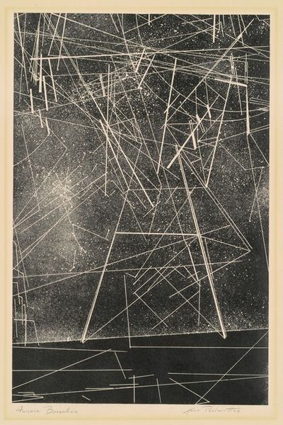This print by Boris Margo is made using etching, a process with a long history in both art and industry. The etcher covers a metal plate with a waxy ground, then scratches away lines to reveal the metal underneath. Immersed in acid, the exposed lines are eaten away, creating grooves. Ink is then applied to the plate, filling these grooves, and the surface is wiped clean. Finally, the image is transferred to paper under high pressure, resulting in the print we see here. Margo’s biomorphic abstraction, with its spiky protrusions, recalls Surrealist art of the interwar period. The laborious, painstaking work involved is crucial; etching is not just a reproductive technique but also a medium for deep creative expression. By engaging with the craft of printmaking, Margo elevates the status of what could otherwise be seen as a purely commercial method, reminding us of the artistry inherent in all forms of making.