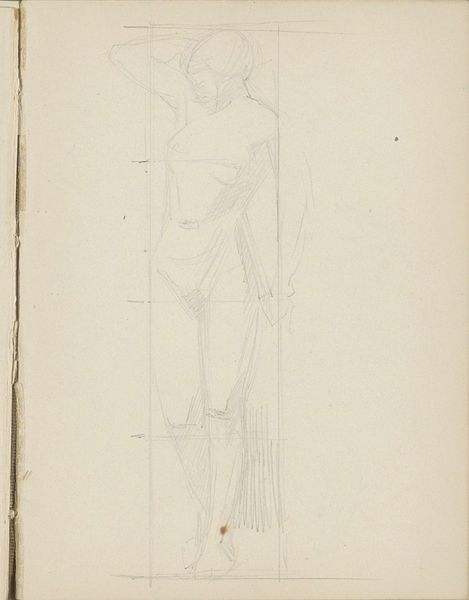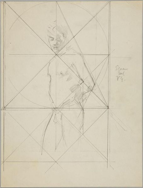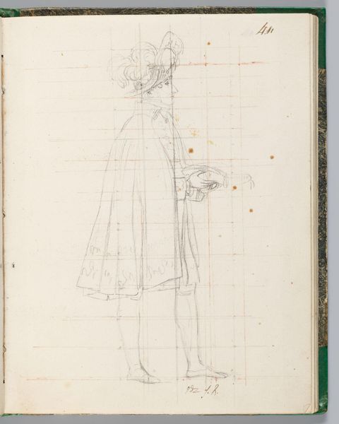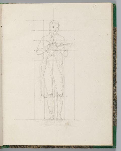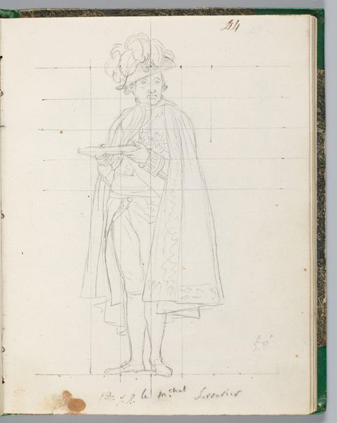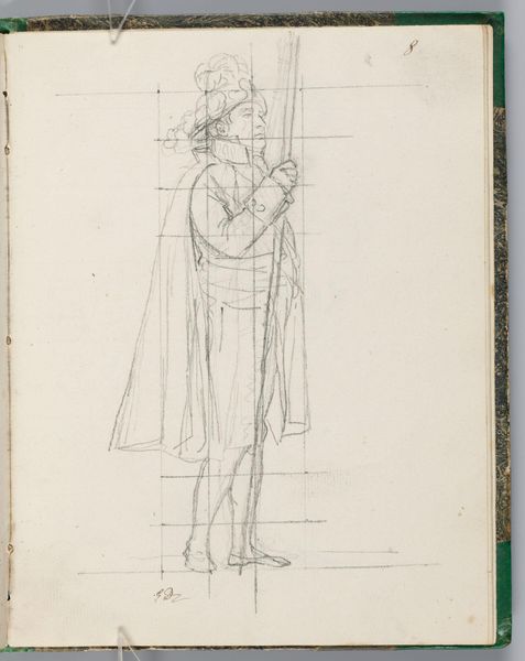 Curator: This is Jacques-Louis David's "Comte de Ségur", a pencil drawing residing at the Harvard Art Museums. Editor: It feels ephemeral. A quick sketch, but the cross-hatching suggests David was interested in volume and form, even in this preliminary stage. Curator: Indeed, the grid overlay shows the meticulous planning behind even what appears spontaneous. Ségur, a prominent figure, embodies the aristocratic milieu David often depicted, a milieu rife with privilege but also caught in pre-Revolutionary tensions. The material of the graphite itself offers insight into the artist's process and intention. Editor: The feathered hat, the cane—these are markers of status, of course. But looking at it now, it's interesting to consider how these sketches provided the foundation for what would become powerful statements on class and revolution. Curator: Precisely. Examining the work through the lens of social stratification and the power dynamics of the time illuminates not just the sitter's identity, but also David’s own complex relationship to his subjects. Editor: It’s a reminder that even a simple sketch like this can be rich with meaning when we consider the means and context of its making. Curator: A fascinating glimpse into the intersection of art, identity, and the socio-political landscape.