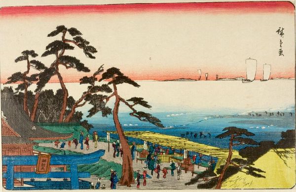 Editor: This is Utagawa Hiroshige's *Tokaido Goju-san-tsugi*. It's part of a series, and the scene feels so vibrant and alive. What sociopolitical narratives are embedded in this piece? Curator: This print encapsulates a romanticized view of travel, but let's consider who is visible and who is not. The laborers carrying heavy loads, the figures at the tea house – their experiences are central to understanding the Tokugawa era's socio-economic structure. Editor: So, it’s not just a pretty picture? Curator: Exactly. It invites us to think about the labor that enabled the leisure represented. Where do you see the intersections of class and gender playing out? Editor: I hadn’t considered that before. Now I see the power dynamics more clearly. Curator: It's about using art to question the systems at play. Editor: Thanks, that really changed my perspective.