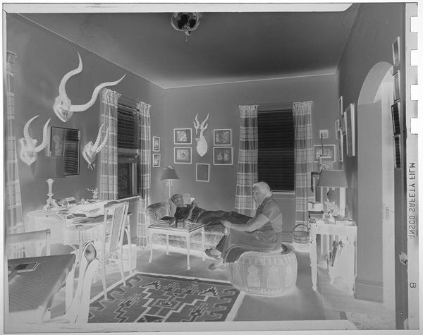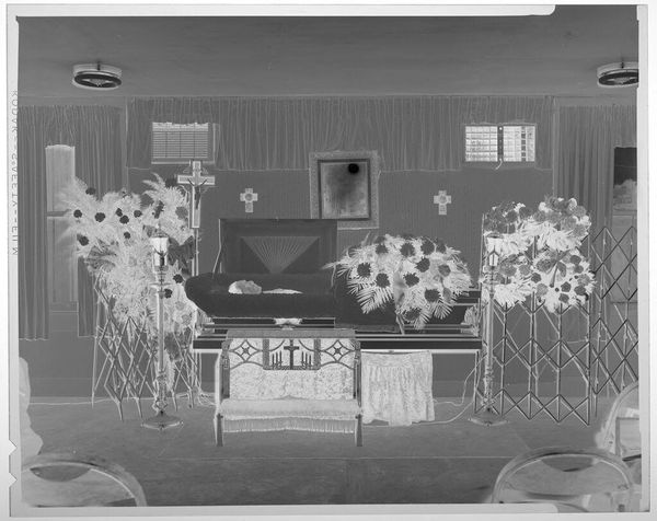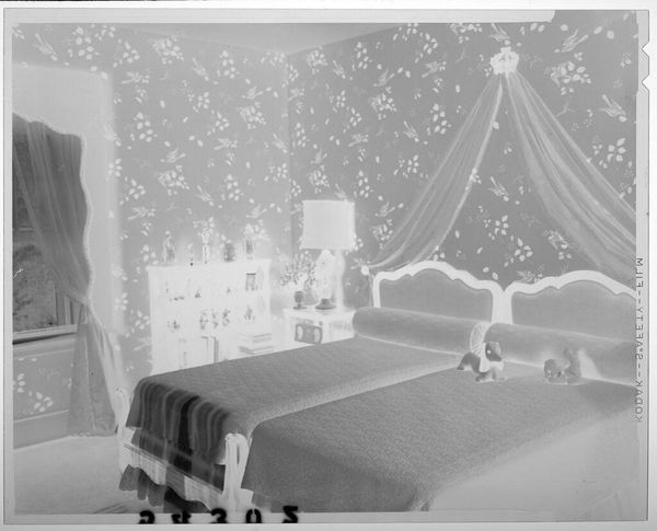Curator: Here we have an "Untitled (interior of bedroom with fancy canopy bed)" photograph by Martin Schweig. I'm struck by its ethereal quality despite depicting something as grounded as a bedroom. Editor: It feels haunted, doesn't it? Like a stage set waiting for the players to arrive, or maybe they've already left. Curator: The negative format and lack of specific dating definitely contribute to that sense of timelessness, almost a dreamlike quality. These images really capture interior spaces that are meant to project a certain kind of aspirational lifestyle. Editor: Absolutely. I see that aspiration in the ornate canopy bed and the carefully arranged details on the dressers. It's a performance of domesticity, meticulously captured by Schweig. Curator: Indeed, it’s both a record and a carefully constructed representation of a space designed for private life. Editor: Yes, and one wonders what kind of private life was lived in the space! Curator: A question for another time, perhaps! But certainly a good reminder of the power of images to evoke stories.
