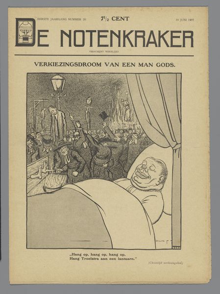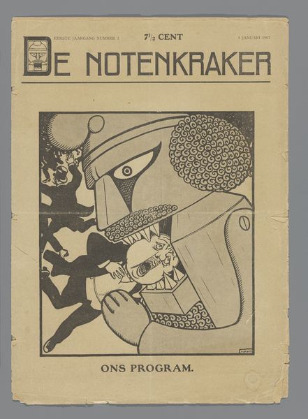 This is a newspaper cover, printed January 12, 1907, by the Dutch artist Albert Hahn. The means of production here are significant. Hahn, working in the tradition of graphic satire, would have created the image as a drawing, which was then translated into a printing plate. Consider the labor involved; from the harvesting of raw materials for paper and ink, to the press operators, distributors and news vendors. The relatively low price of 7 ½ cents made this image accessible to a wide audience, and the messages within it were intended to be even more accessible. The dark lithographic ink gives the image a stark, bold quality, perfect for political commentary. Note how the texture is created; patterns of dots suggest a range of tones, from the sinister face of Von Bulow, to the much smaller figure of a worker hunched over a desk. The statement at the bottom translates to “We have to fight social democracy, otherwise the reaction will become too powerful”. This image is a reminder of how art and labor were intertwined in the political discourse of the early 20th century.