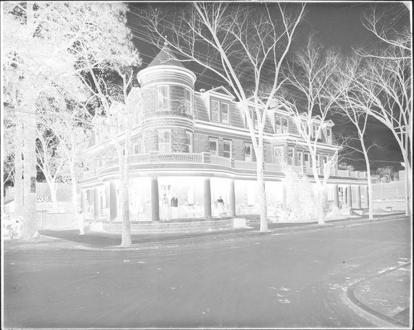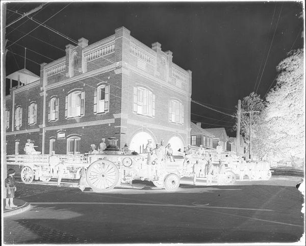 Curator: This photograph, an untitled work by Hamblin Studio, depicts men standing outside T. Jones Cleaning and Pressing. It has an almost ghostly feel, doesn't it? Editor: Yes, that high contrast and those simple brick facades give it a stark, documentary feel. I wonder what kind of labor practices were in place? Curator: Absolutely. The very act of presenting and preserving cleanliness, especially within the context of class and racial dynamics, demands scrutiny. Editor: The building’s brickwork and its utilitarian design really speak to a certain kind of working-class aspiration and the materials readily available. Curator: It's compelling to consider the power dynamics inherent in the business of cleaning and pressing clothes, and who has access to those services. Editor: And how those buildings were constructed, maintained, and what resources and labor are behind the image. Curator: It certainly opens questions about value, access, and visibility. Editor: Indeed, it reveals a lot about the social fabric of the community.