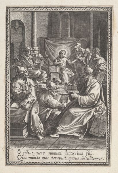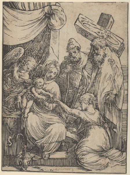 Editor: Here we have "The Virgin Washing the Christ Child," an engraving made sometime between 1520 and 1600 by Giulio Bonasone. There's such tenderness in the way the Virgin is caring for the child, yet the surrounding figures seem almost detached, like a staged tableau. What strikes you about this piece? Curator: The detachment you perceive may stem from the complex socio-political function these images served. These weren't just devotional images; they were often tools of the Church, meant to instruct and inspire, but also to project an image of piety and authority. Bonasone was a reproductive printmaker - that is, his prints like this were based on designs of other artists like Raphael. Editor: So it was about distribution and promotion as much as religious devotion? Curator: Precisely. Consider the figures themselves. They're idealized, almost theatrical, fitting into a pre-established visual language easily understood by the public. But what about the act of washing itself? Think about the period. Cleanliness wasn't just about hygiene; it was also deeply symbolic of purity, both physical and spiritual. The rituals surrounding baptism also come to mind. Editor: I see, so the image is operating on multiple levels – devotion, instruction, and even reinforcing societal values. Curator: Exactly! It's a window into the complex relationship between art, religion, and power in the Renaissance. The composition, staging, and the artist’s own role as a copyist must also be recognized in their contributions to both the contemporary culture and also that of our own time. Editor: It’s fascinating to think how an image could carry so much weight. Thanks; this piece is really multi-layered. Curator: My pleasure; the politics of imagery are so rich!