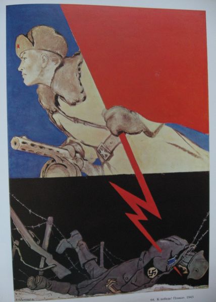 This TASS Window, number 625, called “A lie thrower” is a political poster probably made with stencils, and maybe some hand-painting. The palette is limited, almost drab, except for the aggressive yellows that pop out and feel somehow urgent. The image is of a Nazi officer cranking a machine aimed at another guy in a suit, some politician maybe, who’s basically a loudspeaker, blasting out these jagged yellow lies. It’s a pretty brutal image, but there's a dark humor to it, as in: what a ridiculous thing to invent! This machine whose only purpose is to spew garbage. I keep thinking about that crank, the physical labor of cranking out lies. What does that feel like? There’s something about the flattening of space and form in this poster that reminds me of Philip Guston, if he were a political cartoonist. Like Guston, the Kukryniksy collective isn’t afraid to embrace caricature, to get down and dirty in the service of speaking truth to power. Ultimately this piece tells us that lies may be loud, but truth will always be louder.