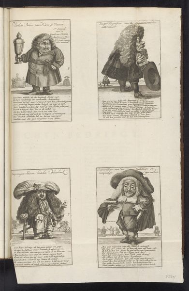 This print from 1720 by Joost van Sassen presents four satirical images related to the speculative bubble of the wind trade. Executed in engraving, the composition is organized into four distinct quadrants, each with a caricature and accompanying text. The use of fine, linear strokes creates a rich, textured surface, enhancing the grotesque features of the depicted figures. The artist uses exaggerated physiognomies to ridicule speculators involved in the financial frenzy. Notice how the figures are rendered as if they are dwarfs, emphasizing their moral diminishment. Each panel employs a visual language laden with symbolism; for example, the figure labeled as an "Actionist" is portrayed with a bestial face emerging from behind, suggesting deception and hidden vices. Van Sassen's strategic use of caricature and the detailed rendering of clothing and objects function as signs within the semiotic system of early 18th-century Dutch society. These distorted representations challenge the established values of prudence and moderation, reflecting a broader critique of economic excess. The detailed execution of the engravings enhances the satirical impact, embedding a critical perspective within the artwork's very structure.