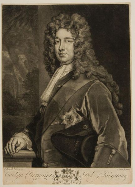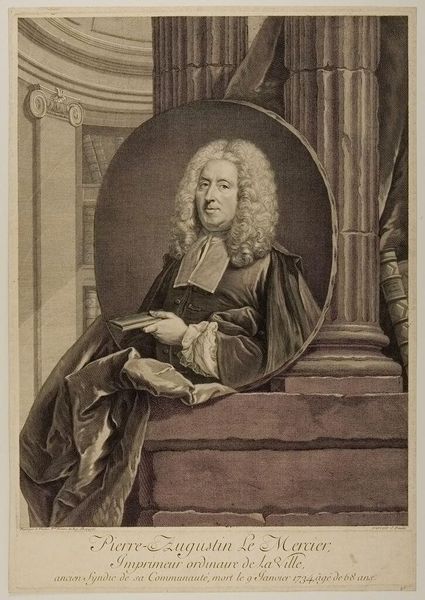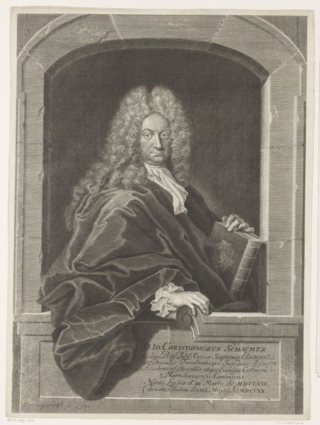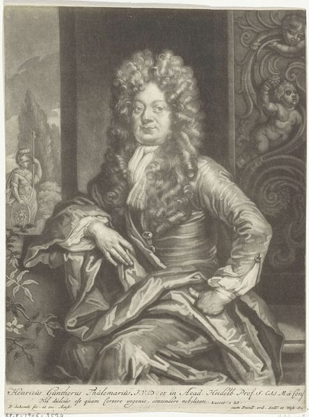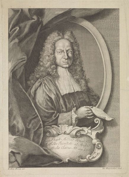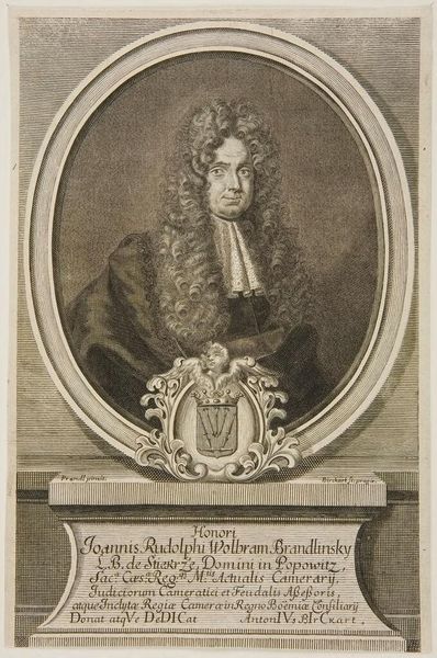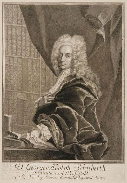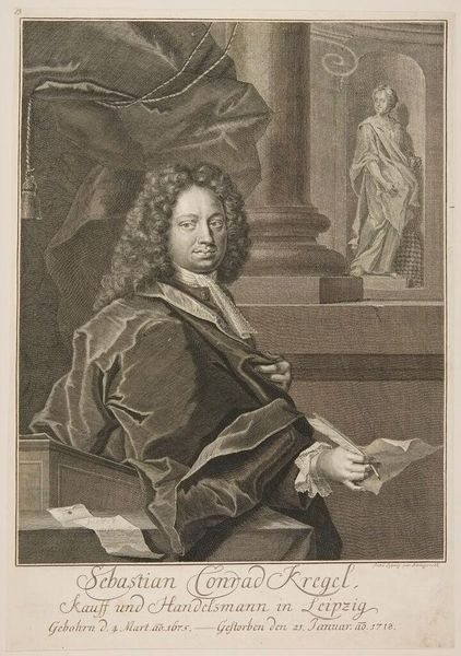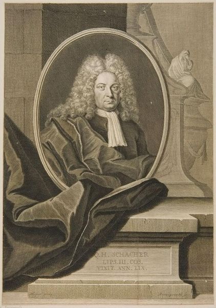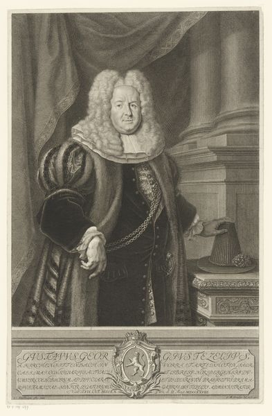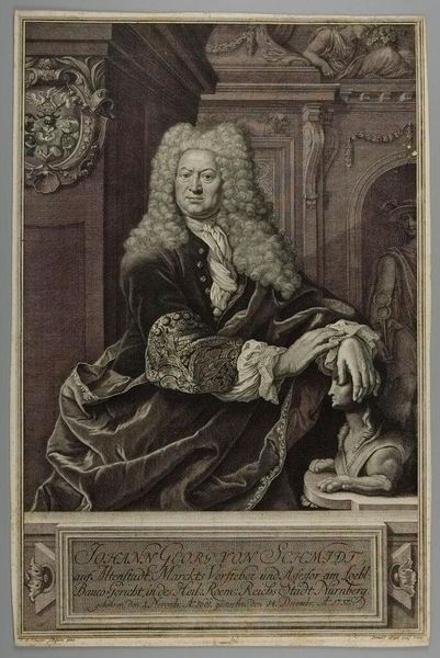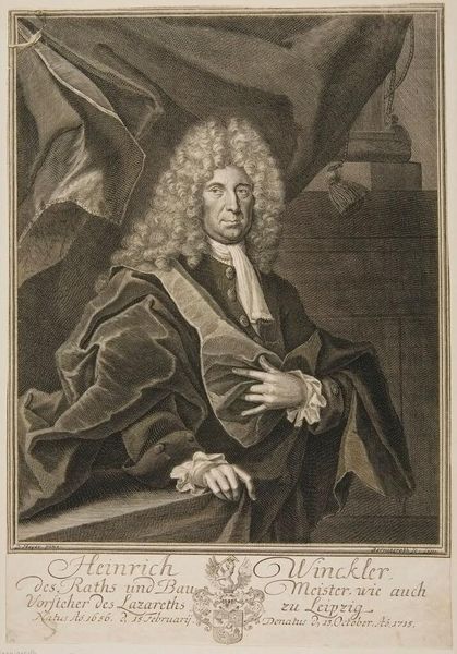 Editor: This is a portrait of Tobias Sutorius von Carlstein by Johann Martin Bernigeroth. What strikes me is the elaborate wig and detailed rendering of his garments. What can you tell me about the social context of such a portrait? Curator: Well, consider the role of portraiture in the 18th century. It was a tool for solidifying social standing. Bernigeroth's meticulous detail, evident in the fabrics and the wig, served to broadcast Carlstein's affluence and status within the Holy Roman Empire. How does the setting contribute to this message? Editor: I see, the column and draped fabric add to the sense of importance. So, the portrait is less about individual likeness and more about societal role? Curator: Precisely. The image promotes a particular construction of power and authority. What does it tell us about the public function of art at that time? Editor: I guess it shows art as a means of reinforcing social hierarchies. Thanks, that really clarifies the historical function of the portrait. Curator: Indeed. Thinking about the art as a social object changes how we understand its visual elements.
