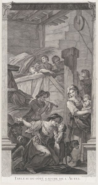 Curator: This engraving, executed by Cornelis Cort in 1602, depicts the Holy Family with Anna and John the Baptist. It’s held here at the Rijksmuseum. What are your immediate thoughts? Editor: Well, the light is really concentrated around the Christ child, nestled securely in Mary’s lap. There's a deep tenderness radiating from the figures surrounding him—almost a palpable sense of quiet anticipation and reverence. The line work is extraordinary too. Curator: Absolutely. Cort was known for his skill with line engraving, adapting the Italian style for a northern European audience. Prints like this were vital in disseminating artistic ideas, allowing artists far from Rome to engage with High Renaissance and early Baroque ideals. We should note this print dates back to when it was published, revealing itself to the cultural environment it was born into! Editor: Indeed. The inclusion of both Anna and John adds another layer. Anna represents the lineage and promise of the Messiah, while John, even as a child, foreshadows the future. It's the iconographic emphasis on divine inheritance and preparation that I find really compelling. Plus that playful cherub nearby alludes to the promise of salvation! Curator: And to bring up an institutional angle, consider that prints like this provided wider access to religious imagery. Paintings remained the privilege of the wealthy, yet an engraving could spread these scenes, thus increasing devotion to the divine. Editor: I also find the setting compelling. The detailed rendering of both the interior and exterior – that villa on the hilltop – makes it feel like we’re glimpsing an intimate, private moment within a grander historical narrative. Curator: It reminds us, of course, that while this is a scene steeped in religious significance, it is also inherently human. A mother with her child, grandparents looking on, friends and family gathered. Editor: A powerful reminder that the symbolic is always grounded in human experience, especially as religious reformers are looking at personal spiritual experience as primary, pushing against institutional frameworks. It adds even further to its lasting appeal for many centuries after! Curator: Ultimately, I think this print offers insight into how religious narratives were visualized and disseminated in early modern Europe and the intersection of social and religious themes. Editor: Yes, it really illuminates how core beliefs were conveyed through visual language and how this image continues to emotionally resonate to this day.