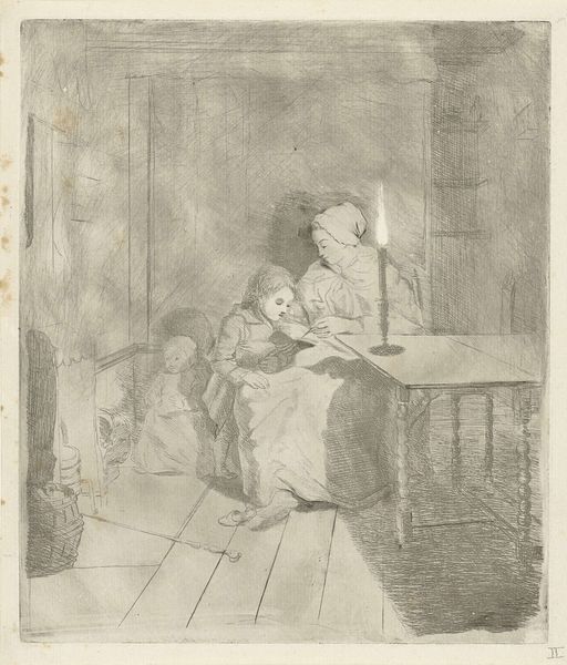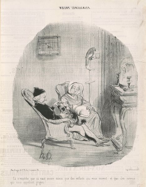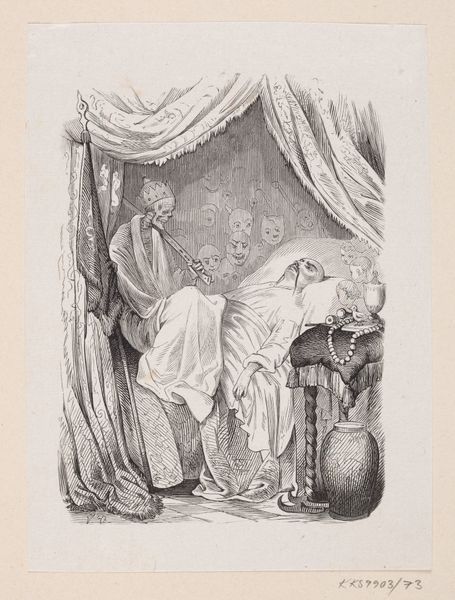 Editor: We're looking at Lorenz Frølich's "Little Girl Showing a Birdcage to a Smaller Boy in Bed," created in 1878. It appears to be a drawing, perhaps ink and pencil? The detail is really striking, and there's something so gentle about the way the older child is presenting the birdcage. What strikes you when you look at this work? Curator: Primarily, the composition’s arrangement into circular forms is crucial. Observe how the dark shading curves from behind the figures, mirroring the curve of their interaction. It visually binds the two children together, intensifying their shared gaze upon the cage. Do you perceive a dialogue between constraint, represented by the cage's sharp rectilinear structure, and freedom, signified by the bird it holds? Editor: I do see that now. It is interesting how those geometric forms play against each other. I was so focused on the tenderness, but the formal contrast is definitely there. Does the line quality contribute to this? Curator: Precisely. Notice the fine, almost etched, lines forming the cage in contrast to the looser, softer lines defining the figures. This emphasizes the stark division I previously alluded to, and moreover, speaks to a hierarchy. Note too, if you will, that the bird is scarcely detailed - its essence is suggested, not delineated, drawing attention to the cage, not its captive. Is there a semiotic value in this construction? Editor: So the contrast invites us to interpret a kind of story here...a story of contrasts, like sickness versus health. But I also wonder if we aren't over-reading it a little? Curator: The beauty of semiotics lies not in definitive answers, but rather in its capacity to provide possible interpretative tools. Is it simply a picture of a little boy showing a bird to another boy, or is there indeed a greater theme portrayed via geometry? Our method provides options in approaching art and discourse. Editor: I hadn’t considered how the simple lines could tell such a complicated story through shape and direction. Thanks for pointing that out. Curator: My pleasure. Observing the formal qualities allows for much broader understanding, and from these considerations further analyses may proceed.