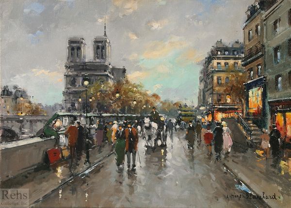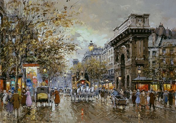 Editor: We're looking at "Le boulevard Saint-Denis à Paris," painted by Jean Béraud in 1899. It's an oil painting, and the city scene gives me such a melancholic feeling. It looks like a drizzly day. The reflection of the light on the wet ground gives movement and dynamism to the scene. What draws your eye when you look at this piece? Curator: It whispers stories of a Paris caught between two eras. Béraud, the sly observer, understood that impressionism wasn't just about capturing light; it was about bottling a feeling, an experience. Notice the anonymity of the figures; each is a fleeting character in a play we only see a single act of. Look how Béraud creates light from darkness; the brilliance reflecting off the cobblestones creates such drama! What do you imagine those people are thinking about, Editor? Editor: I wonder if they're worried about getting wet! I didn't notice at first, but is that a theatre in the background, right above the Metro entrance? I’m really starting to appreciate all of the subtle detail in this painting! Curator: You’ve hit on something important. It's a slice of Parisian life. Béraud’s work, unlike some of his Impressionist contemporaries, isn't just about pure landscapes; he wants to capture something true to his epoch. Editor: So it's a record of history as well as an artwork? That's a whole different perspective. It definitely encourages a closer, slower look. Thanks. Curator: Precisely. Art opens portals and slows the moment, a window into the ever-fleeting now. My pleasure.