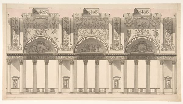 Editor: Here we have Giacomo Quarenghi's "Central Salon of the Alexander Palace at Tsarskoe Selo," a drawing and print from the late 1790s currently residing at the Met. It's really amazing to me. There’s a fascinating, almost dreamlike quality to the precision of the architecture. What particularly strikes you about this piece? Curator: You know, dreamlike is spot on. It's a ghost of a space, isn't it? This echoes the neoclassical style that was all the rage, looking back to a romanticized version of ancient Greece and Rome. I see not just an architectural rendering but an exercise in aspirational history-making, with every detail, from the angels to the urns, chosen to whisper "grandeur" and "timelessness." Do you notice how the flatness of the rendering almost feels like a stage set? Editor: It really does, like a backdrop awaiting a play! So it’s less about function and more about projecting a specific image of power? Curator: Exactly! Quarenghi wasn’t just designing a room, he was crafting an image of imperial authority and cultivated taste. These palaces were power made visible, but sometimes it feels as if the people themselves are optional extras. Who needs people when you have marble columns and perfectly placed allegorical figures, right? Editor: That's a bit cynical. Curator: Perhaps, but who knows? The world is cynical. Now, I cannot stop from looking at the drawing. Is that intentional or simply a characteristic of age and material? Editor: Maybe it adds another layer. The Salon in reality, then idealized. Thank you! I would've thought twice as much. Curator: Anytime. Now go dream. And may your neoclassical fantasies always have room for a touch of playful chaos.