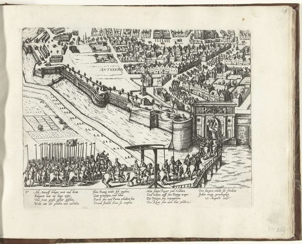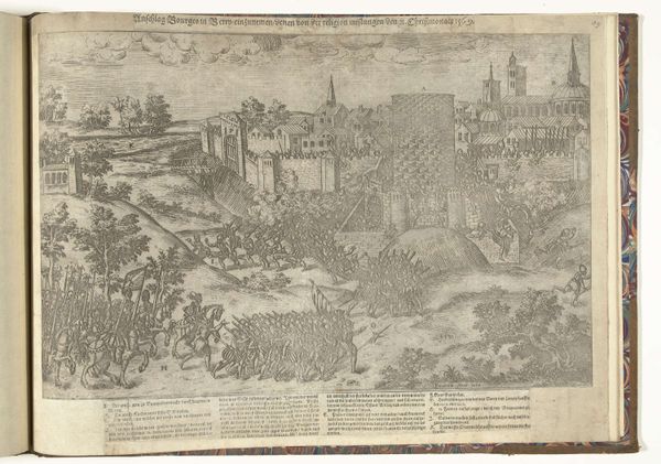 This print, made in 1602 by an anonymous artist, captures the siege of Ostend. It’s an engraving, a printmaking technique that involves cutting lines into a metal plate, applying ink, and pressing it onto paper. This was a common method for disseminating information, and also for artistic expression. The material itself – metal, ink, paper – speaks to a world of mechanical reproduction and mass communication. The dense lines create a sense of chaos and movement. The print conveys the intensity of the battle, with tiny figures clashing amidst fortifications and smoke. Engraving demanded skill and labor, and the resulting prints could be widely distributed, shaping public opinion. This print offers a glimpse into the social and political landscape of the time, reflecting the era's conflicts and technological advancements. By considering the materials, making, and context of this print, we can appreciate its significance beyond aesthetics, recognizing its role in shaping cultural narratives and challenging traditional distinctions between art and craft.