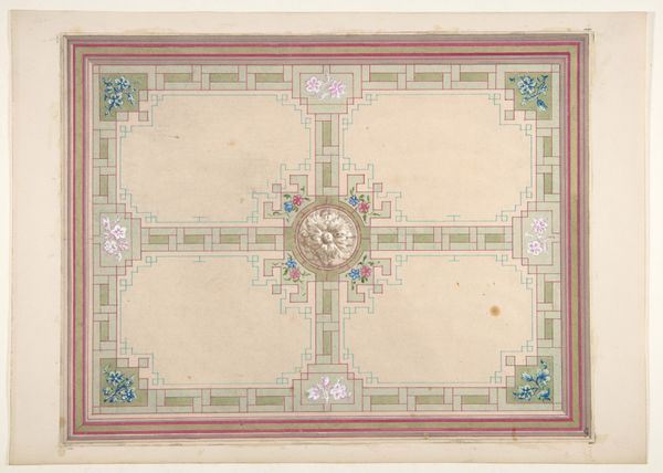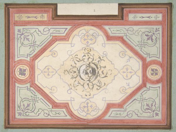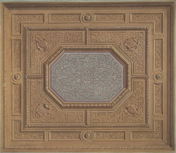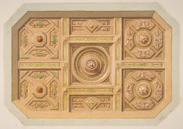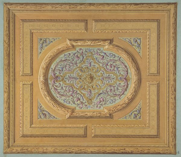 Jules-Edmond-Charles Lachaise rendered these alternative designs for a painted ceiling decoration in watercolor, gouache, and graphite, possibly in France. The design evokes the architectural details of the 18th century, with its emphasis on classical motifs like stylized leaves and palmettes, organized in geometric patterns of rectangles, squares, and circles. It presents us with a vision of how institutional spaces, such as aristocratic residences, government buildings, or museums, would have asserted power and projected authority through a sense of ornamented order. The effect is one of controlled opulence. In thinking about this artwork, we can look at the history of interior decoration, or investigate archives of French design. We might also consider how museums in France or America collected and displayed decorative arts. Looking closely at an artwork like this one reminds us that art always exists in a social and institutional context.