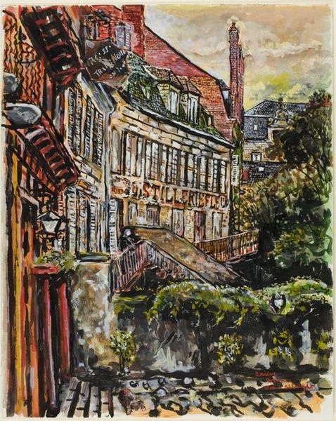 Editor: This is Czóbel Béla's "Falusi Utca," or "Village Street," created in 1906. It's a vibrant watercolor that almost feels like an oil painting due to its density. The houses look cheerfully ramshackle. What feelings or stories does this cityscape evoke for you? Curator: The vibrant palette immediately grabs my attention, doesn't it? Those unorthodox color choices aren't just aesthetic; they reflect the emotional energy of early 20th-century art movements. It reminds us of Fauvism, celebrating emotive expression above naturalistic representation. The skewed perspective suggests a world slightly out of joint. Do you notice the symbolic weight given to the architecture of ordinary life? Editor: Definitely, the wonky houses and vivid colours give it a slightly unsettling quality. I see how that links to Fauvism, with its emphasis on raw emotional response. Why highlight something like a "village street"? Curator: It presents the vernacular, elevates the everyday. In this period, such themes become ways to explore collective identities and cultural memory. Think of it this way: How does the presence of such bold colors – set against conventional architectural forms – challenge or uphold notions of belonging, of "home?" The colors can be disruptive. They are almost fighting the rigidity of the houses. Editor: So it’s about playing with familiar images, using color and composition to disrupt our expectations? Almost like a visual argument? Curator: Precisely! It also reminds us of cultural narratives; how the village street, despite its name and humble state, holds a shared sense of cultural history. Every line and colour hints at memories layered upon memories, right? Editor: That's really interesting! I hadn't thought about the colors disrupting the everyday, but I see what you mean now. Thank you for pointing out all of these elements; I have such a greater appreciation for this image. Curator: My pleasure, hopefully you’ll carry an interest for cultural memory expressed in visual form with you!