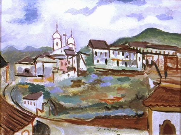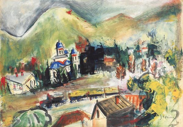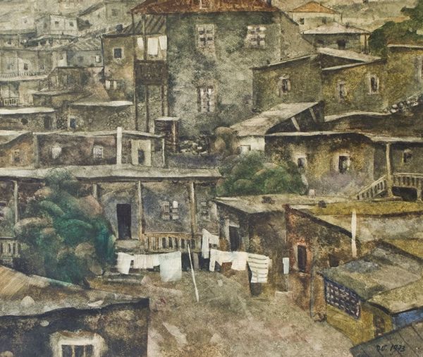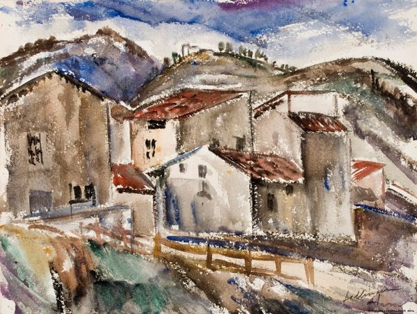 Curator: This is Nicolae Darascu’s "Balcic Houses," a watercolor cityscape from 1933. The loose brushstrokes and muted colors create a dreamlike atmosphere. What are your initial thoughts? Editor: It's incredibly picturesque, almost intentionally so. There's a strong sense of imposed order onto what must have been, in reality, a much more complex and potentially chaotic environment. Curator: Indeed. Observe the composition: the houses cascade down the hillside, creating a visual rhythm. Note, too, the restricted palette; predominantly earth tones, offset by cool blues and greens. The limited use of intense color guides our eyes and unifies the image. Editor: It strikes me as an orientalist fantasy more than a document of a place. Balcic was a multicultural space at the time, and that's absent here. We only get a sanitized version that probably catered to the expectations of a European gaze. Who gets to represent this landscape? Whose story is erased? Curator: Those are valid points. However, one might also consider the artistic lineage: Darascu, as a key figure of Romanian Impressionism, uses light and shadow to dissolve the solidity of forms, prioritizing atmospheric effects over precise architectural rendering. Consider, for instance, how the rooftops are delineated; we see more wash than distinct structures. Editor: But this emphasis on atmosphere, it deflects from social realities, doesn't it? What were the lives of people in those houses actually like in 1933? To divorce artistic technique from the socio-political climate feels insufficient. Impressionism, often praised for capturing a fleeting moment, sometimes seems to freeze moments *away* from history. Curator: A compelling critique. Still, it is beautiful! Its aesthetic lies in its simplicity. Its appeal stems from the skillful management of form and the harmonious orchestration of tone. Editor: And what I see, too, is how easily beauty can distract from or mask deeper problems. So, I’m left to ponder those difficult questions while appreciating the surface of Darascu's landscape painting. Curator: A powerful reminder that engagement with art requires sensitivity, looking beyond first impressions and acknowledging a plurality of perspectives.