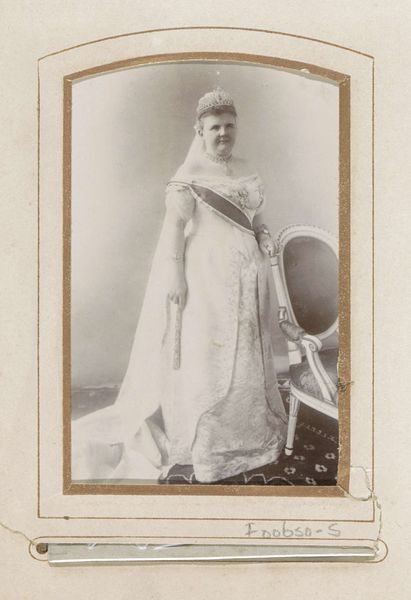 This is Max Cosman's photographic reproduction of a painted portrait of Queen Wilhelmina, currently held at the Rijksmuseum. The portrait, encased in a rectangular frame with an oval window, immediately draws the eye to the monochromatic image of the queen. The visual structure is striking; the artist has used the geometric frame to contain and define the softer oval portrait within, creating a play between rigidity and smoothness, setting and subject. Observe how the formal framing emphasizes Wilhelmina, whose gaze meets ours directly. Note how the crown and jewelry are not mere embellishments but function as semiotic markers, underscoring her status and power. This photographic reproduction is not just an image but a structured statement. It balances historical representation with formal artistic choices to subtly negotiate themes of power, identity, and representation. The choice of a photographic reproduction is an interesting comment on authenticity and the proliferation of images during this time.