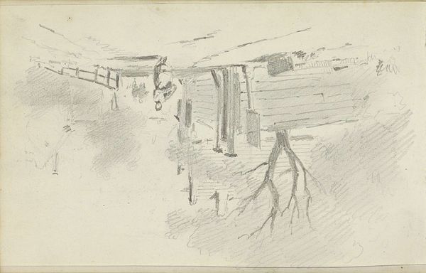 Editor: This drawing, "Weiland met koeien bij een sloot" or "Pasture with cows by a ditch," created between 1848 and 1888 by Anton Mauve, is a study in pencil. There’s a vulnerability in the sketchiness. What sociopolitical themes do you see emerging from this tranquil, natural scene? Curator: Tranquility can be deceiving. I see the lingering effects of industrialization. The restrained palette hints at the shifting economic landscapes, a pre-industrialized vision on the cusp of change. Mauve lived in a time of mass migration from rural communities to the cities, right? Editor: Yes, there were many changes during Mauve’s lifetime. The rural population became significantly smaller, but what does that tell us about this particular image? Curator: Look at the cows. They seem almost huddled together, marginalized within their own habitat. Mauve isn’t just painting a landscape. He subtly comments on the displacement felt by both humans and animals as agrarian societies transform into modern economies. How does the line work contribute to this interpretation, in your opinion? Editor: The sketchiness feels almost rushed, as though he’s trying to capture a fleeting moment before it disappears, and there's this subtle interplay between the detailed cows and the vaguer background. Curator: Exactly. He captures this turning point of his society with that very conscious vagueness. Mauve implicates viewers of later eras. How do we want to value, or exploit, this landscape now? What kind of responsibility to the non-human animal do we have? Editor: I didn’t consider how a drawing of cows could ask such weighty questions! Thanks, it helps reveal some really nuanced layers to what seems a gentle image. Curator: Art opens up the space for this sort of critical questioning; I learned so much from hearing your perspective.