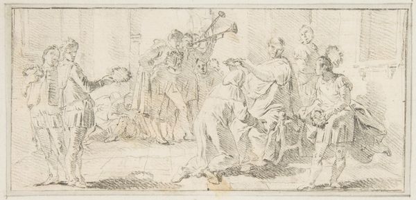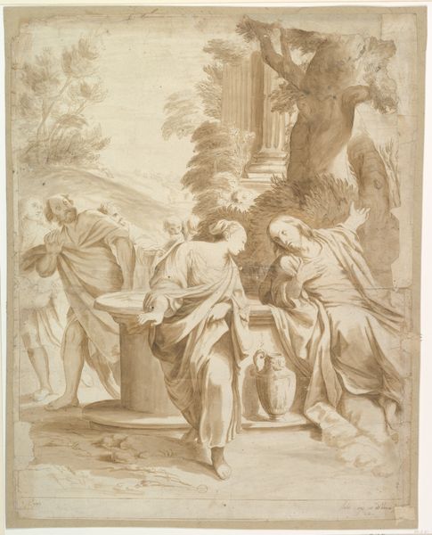 Editor: This is Pietro Testa’s “The Prophecy of Basilides,” made around 1648 or 1649, using charcoal. The composition is striking. It seems like we’re witnessing a very dramatic, perhaps even supernatural, event unfolding. What strikes you most about this piece? Curator: From a historical viewpoint, Testa's work presents an interesting intersection of artistic ambition and social context. He attempts to align himself with the tradition of history painting. Are you familiar with Basilides? Editor: Vaguely, something about early Christian Gnosticism? Curator: Exactly. Testa, aiming for intellectual credibility, depicts a scene involving this figure, connecting to broader interests in philosophy and religion within the literate circles of his time. The question arises: for whom was this complex imagery intended, and what socio-intellectual message did it convey? Editor: So the choice of subject matter speaks to Testa's aspirations and the audience he hoped to reach? Curator: Precisely. It also showcases his visual intelligence, synthesizing a lot of artistic influences, and a visual compendium with layers for the learned spectator to interpret and discuss, similar to practices of collecting and antiquarianism prevalent at the time. Do you get a sense of Testa’s artistic aspirations based on his selection of Basilides and rendering of this composition? Editor: It does seem like he wanted to be taken seriously as an intellectual artist, and this drawing reflects that ambition through its engagement with history. It’s helpful to think about art as being rooted in broader societal factors, and it gives me new perspective on this charcoal work! Curator: Indeed, viewing art through a historical and cultural lens enables richer and more comprehensive appreciation of its meaning and role.