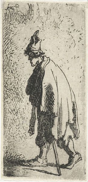 This print, *The Blindness of Tobit: A Sketch,* was made in the early to mid-1800s by William James Smith, using etching on paper. The artist would have covered a metal plate with a waxy, acid-resistant ground, then scratched away lines to expose the metal. Immersing the plate in acid would bite into the metal, creating recessed lines. The more time in the acid, the darker the lines appear in the print. Then, the plate is inked, the surface wiped clean, and the ink remaining in the etched lines is transferred to paper through a press. Here, the material qualities of the metal plate and the artist’s skilled manipulations in etching have given the image a specific visual language. Notice the cross-hatching and varied line weights used to create tone, shadow, and texture, as well as the density of labor involved in creating the matrix, which is so at odds with the diminutive scale. Thinking about the making of this print reminds us that art is not just about the image, but also about the processes and techniques that bring it into being. This challenges traditional hierarchies between fine art and craft.