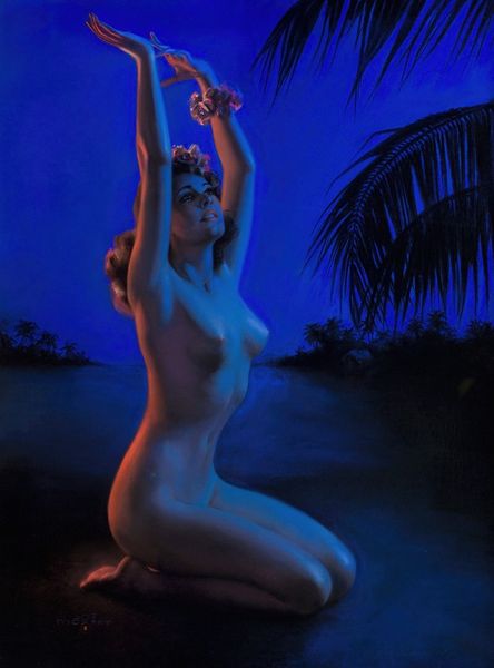 Aaron Nagel created this oil painting, All Across II, in the twenty-first century. Nagel is a contemporary realist painter, whose work often centers around figurative depictions of women. Here, the artist creates meaning through the visual codes of portraiture, such as pose, costume, and setting. The woman's partially undressed state, combined with the gold jewelry and indistinct black background, may allude to the objectification of women. One possible reading of the image could be that the woman is reflecting on this objectification. The cultural history of Western art provides us with many examples of the male gaze, and Nagel's painting seems to be contributing to this conversation. In order to fully understand the artist's intentions, one may study other works by the artist, delve into historical records, and explore the socio-political context in which this artwork was made. This painting exemplifies how art can be used to critique the institutions of its time.
