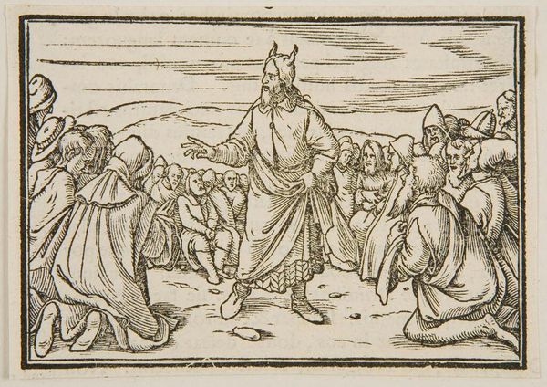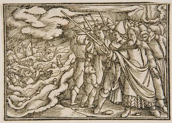 Curator: This anonymous woodcut, titled "God Speaks to Moses", presents a potent depiction of divine authority. Editor: The stark black and white creates a dramatic tension, and the figure of God emerging from the cloud feels both ethereal and commanding. Curator: Absolutely. It's important to see this image in relation to the history of religious representation, especially during periods of intense social and theological upheaval. Who holds power, and how is that power visualized? Editor: I see the repetitive lines carving out forms that carry significant weight, especially God's gesture. Curator: This visual language situates the viewer within a specific interpretation of scripture, potentially reinforcing existing power dynamics or, conversely, challenging them. Editor: The composition invites us to consider how linear elements, texture, and light combine to shape our perception. Curator: A compelling reminder of the intersection between art, faith, and social power. Editor: It's fascinating how a seemingly simple image yields such complex considerations.