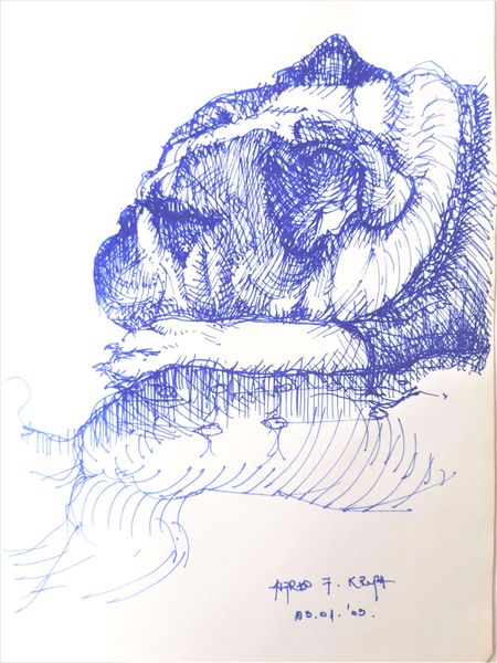 Alfred Freddy Krupa made this graphite drawing, Bobi Poses, on paper, and what I see right away is how the marks are like a kind of shorthand, building up the form through a network of lines. It's almost like he's feeling his way around Bobi’s shape. Up close, you can really see the layering, how he uses the direction and density of the lines to suggest form and shadow. Take a look at the eye, how it's rendered with this dense cluster of marks, giving it a real sense of depth and focus. You can almost feel Bobi looking back at you. There is a rawness, an immediacy to the drawing that reminds me of Picasso's quick sketches, or maybe even some of the expressionistic animal drawings of Franz Marc. It is a reminder that art is not just about perfection, but about capturing a moment, a feeling, an idea.