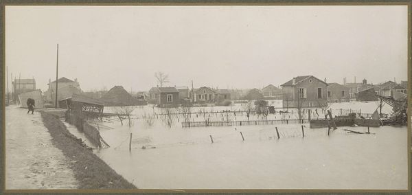 This panoramic photograph shows a flooded suburban landscape in Paris and was made by G. Dangereux. It’s like a washed-out, sepia dream, where buildings peek from the water like memories half-submerged. Look how Dangereux uses tone, it's all about subtlety; the light reflecting off the water becomes this gray blanket, connecting everything. The texture of the villa on the right is heavy, solid, still standing despite the devastation around it. The eye dances with the ruined sheds that disrupt the scene; they are the active marks in this otherwise still image. It makes me think of Eugène Atget and his photographs of Paris, with the same mix of documenting the city and finding something weird and beautiful in the everyday. Art’s not always about answers; sometimes, it's about sitting with the questions.