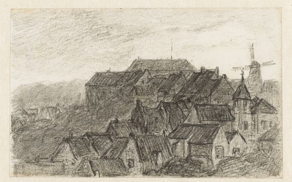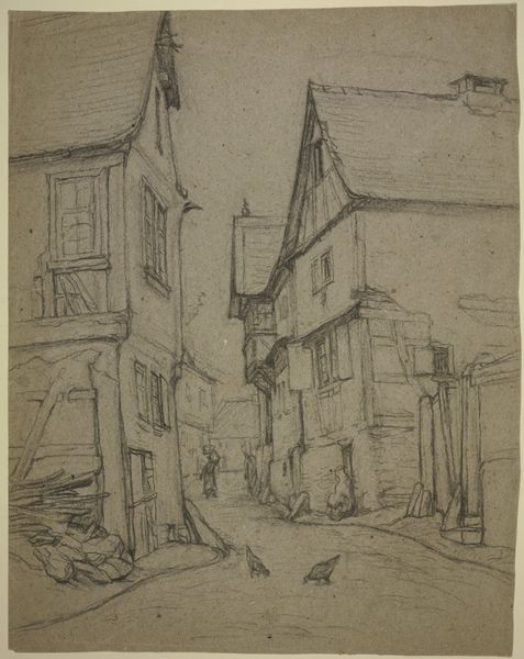 Curator: Ah, look at this sketch. It’s Thomas Dielmann’s "View from Seeheim", made in 1914, held at the Städel Museum. A delicate pencil and ink rendering. Editor: It has this lovely, quiet feel to it. Makes you want to wander into that village, disappear into its story. Like stepping into a half-remembered dream. Curator: Dielmann was part of the German Expressionist movement, but this drawing feels more intimate. You get a sense of the artist's direct observation and skillful control over materials, pencil and ink, to define the built and the unbuilt spaces of Seeheim. Editor: Expressionism usually shouts, but this whispers. Look how lightly he touches the page to indicate those figures. They almost float. Makes you wonder what he was thinking at that moment, just watching. Curator: Think about the process of creating a sketchbook drawing like this, too. Dielmann wasn't just capturing a likeness; he was making a record of place, likely using readily available, affordable materials and techniques transferable to others. What we see is a kind of art of the everyday—made manifest through line and value. Editor: Exactly. The star-like sign on the building to the left intrigues me. Is that a shop or a hint to Dielmann’s personal affiliations? Whatever it is, it infuses the scene with this touch of symbolic light. Curator: We should remember the drawing dates from 1914. World War I was about to erupt, an era of momentous, shattering change and mass industrialisation which is markedly at odds with Dielmann’s dedication to creating delicate handmade scenes such as this one. The means of representing the place through an older form perhaps underscores the changes felt in the moment. Editor: It does, doesn't it? There’s a fragility to the lines that suggests a world on the brink, clinging to its beauty. As if capturing the scene was also about trying to preserve a vanishing sense of time and place. Curator: Ultimately, "View from Seeheim" becomes this potent statement about art-making within rapidly changing social conditions. Editor: A reminder to pause and find wonder in quiet corners. Thank you for shedding light on its story!