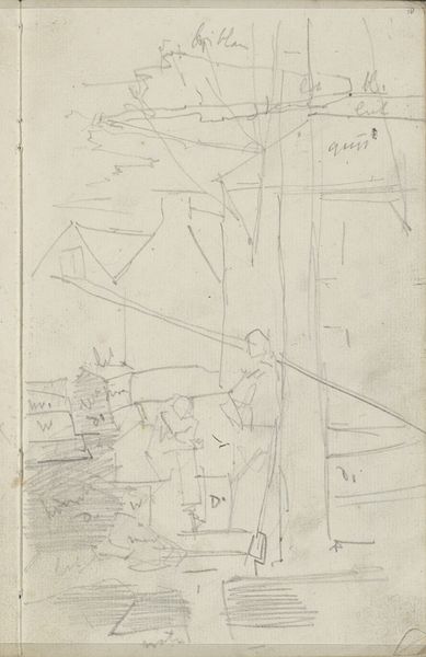 Curator: Here we have "Studie," a sketchbook page from George Hendrik Breitner, created sometime between 1887 and 1889. Editor: My initial impression is a feeling of fragility, or maybe it’s impermanence. The faint lines and the aged paper convey such delicacy. It's clearly a preliminary work. Curator: Indeed. Breitner is celebrated for his gritty depictions of Amsterdam, but what often gets missed is the intensive study and preparatory work that went into those canvases. This is a page plucked from a personal sketchbook offering a rare glimpse into his process. Editor: The rawness is striking. There's none of the gloss we often associate with finished artworks destined for gallery walls or wealthy patrons. It's immediate, direct. What is interesting is how the bareness can point to wider, political concepts on labour and work ethics that came in as society modernized in the nineteenth century. Curator: Absolutely. This sketchbook leaf disrupts the notion of the artist as a detached genius effortlessly producing masterpieces. Breitner's urban scenes weren’t just stumbled upon; they were constructed through observation and careful planning, evidenced here. The sketch suggests a rapidly captured moment—maybe the infrastructure or outlines of buildings along an Amsterdam canal, but rendered with minimal detail. Editor: It almost feels like resistance to the polished artwork promoted by art institutions back in the day. Here is Breitner actively engaging with a specific context with an accessible visual language for people, not just appealing to art critics! Curator: I agree. Breitner often prioritized realism over idealization. He wasn’t concerned with painting a sanitized version of city life; he captured it in its complexity, as seen here as he began conceptualizing it, but would eventually paint it. And remember the social upheaval in Europe at the time and in Amsterdam: Breitner showed empathy for workers as it transitioned to industrialized times. This sketchbook is a fascinating insight into how such a position was formed, and materialized. Editor: This is a potent reminder that art isn’t just about the final product, it’s about the journey, the questioning, and the labor involved. Breitner's page encourages a more critical look at art production, class, and the way these are exhibited at elite art institutions. Curator: Thank you, that gives me a new way to view Breitner’s sketches! Editor: Thanks to you too, this was really insightful and an insightful exchange on social change and artistic expression.