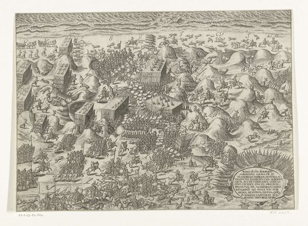 This detailed etching shows the siege of Hoogstraten Castle in 1603, part of the Eighty Years' War between the Dutch Republic and Spain. Created by an anonymous artist, it visualizes military strategy and power, but also reveals the social dynamics of the time. Notice how the artist meticulously maps the siege, blending topographical accuracy with symbolic representation. The Dutch, led by Maurits, are depicted liberating the castle from mutinying Spanish soldiers. This reflects the Dutch Republic's struggle for independence and its narrative of liberating people from oppression. Consider how this image was intended to be viewed. It reinforces Dutch national identity and justifies their military actions. To understand this artwork fully, we need to consult historical documents, military reports, and political pamphlets from the period. The meaning of this image is not fixed, but is shaped by the social and institutional contexts in which it was created and viewed.