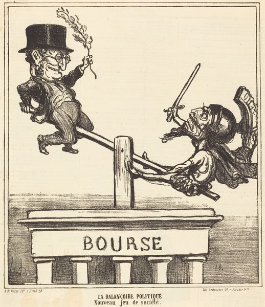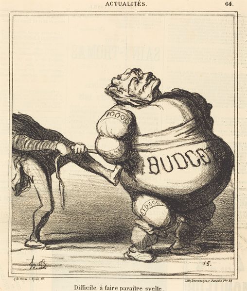 Curator: Daumier's lithograph, "Like Sisyphus," depicts the mythological figure condemned to endlessly roll a boulder uphill. Notice here, the boulder is labeled "Budget." Editor: The image feels crushing, doesn’t it? The weight seems unbearable, emphasized by Daumier's stark contrasts. Curator: Absolutely. Daumier uses Sisyphus as a metaphor for the endless, futile struggles against political systems and economic policies in 19th-century France. It speaks to cyclical oppression. Editor: And the budget as the symbolic boulder, representing the burdens unfairly placed upon the people. One can easily see the lasting impact of antiquity's visual language. Curator: Indeed, the image's power comes from its layering of classical imagery with contemporary social commentary. Editor: It's a powerful reminder that some struggles remain timeless across different societal contexts. Curator: Precisely; this lithograph reflects an ongoing fight against systemic injustice.
