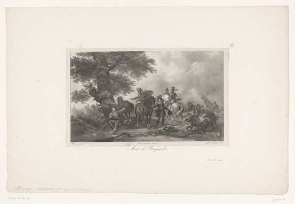 Curator: What stands out to you about Pietro Antonio Martini's 1774 engraving, "Ruitergevecht met op de achtergrond een molen?" The "Rider Combat with a Mill in the Background," as it translates. Editor: Well, initially, the landscape and figures seem very dramatic. It looks like it was produced by engraving techniques. How would you approach this engraving from your point of view? Curator: From a materialist perspective, I'm drawn to the labor involved in producing this engraving. Consider the process: the physical act of etching the image onto a plate, the specific tools used, the types of inks and paper available in 1774. This isn’t just an image; it’s a record of human skill, material constraints, and consumption patterns of the era. Editor: So, you’re focusing less on the "story" of the combat and more on the physical production itself? Curator: Precisely. The material tells a silent history. Think about the accessibility of this image. Engravings were a way to democratize art, to reproduce images on a scale previously impossible. Who was the intended audience and what can the artwork suggest about period style, the historical-social background and visual composition? What social functions would this particular type of art fulfil at that time? Editor: That makes sense. I never thought about how an artwork can be viewed like that. Thank you for this different understanding.