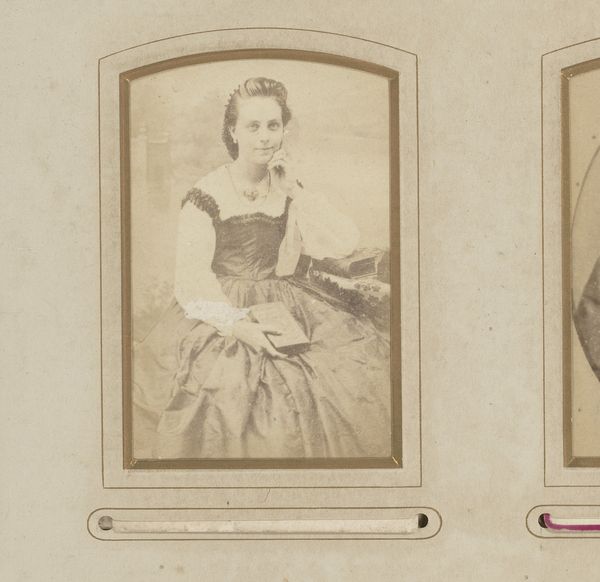 Curator: Let's turn our attention to this remarkable photograph entitled "Portret van een staand meisje met hoed," or "Portrait of a Standing Girl with Hat." It's believed to have been taken sometime between 1882 and 1911 by Adrien Louvois. Editor: Oh, she has such a melancholic aura about her, doesn't she? The textures are amazing. The stiffness in her posture, almost heartbreaking—makes you wonder about her story, frozen there. Curator: Yes, indeed. As a portrait from the late 19th century, we need to examine the production of photographic prints, which during this time involved meticulous chemical processes. Albumen prints, like this, were especially popular and required carefully coating paper with albumen, from egg whites, before exposure. The level of detail that such processes rendered reflects on broader social ideas concerning presentation and memorialization. Editor: The shadows and tones remind me of old storybooks I used to read, ones filled with ghostly tales and whispered secrets. Did folks really carry themselves with that much seriousness all the time? Curator: Well, photography was becoming more widespread, allowing access across classes to new modes of capturing identity. So while the well-to-do might parade themselves in finery, new markets in the making made it easier to engage the studio photographer to promote one's station. So to speak. But there was another thing too: posing times for portraits were longer at this point than they are for photographs taken these days. Editor: Imagine the labor and expense that goes into her elaborate garments. Look at the puffed sleeves, the little gloves—each piece screaming status and constraint at the same time. Curator: Precisely. Her apparel reveals a social milieu with intricate economic relations— the cloth makers, dressmakers, those crafting her hat, and all the merchants moving these items— each a node of work connecting the young lady to expanding market networks. And a rising merchant class who now sought to imitate aristocratic bearing and accoutrements. Editor: So much bottled up in that little frame. I almost feel a kinship with this serious, overdressed child... such echoes linger, like ghosts in an old photograph. Curator: A telling insight. Examining her world from a materialist viewpoint allows us insight to that complexity and a renewed reflection on the image.