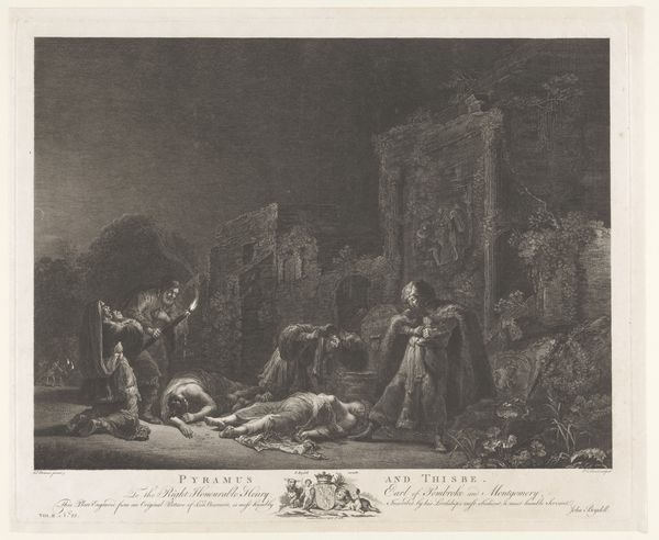Curator: Before us we have "Evocation of the Dead," an etching and engraving from around 1770, attributed to Joseph Francoise Foulquier, after a design by de Loutherbourg. What’s your immediate take on this rather theatrical scene? Editor: Well, immediately, the chiaroscuro grabs you. The intense contrast emphasizes the figures – both living and, presumably, undead – against this gloomy backdrop. The composition feels deliberately staged, doesn't it? Like a moment plucked from an opera. Curator: Indeed. De Loutherbourg was known for his theatrical set designs. So this print functions, in a way, as a reproducible commodity reflecting that aesthetic for broader consumption, correct? Think about the role of printmaking in disseminating these kinds of visually stunning spectacles during this period. Editor: I see what you mean; but looking at the image's structure it's difficult to know exactly where the vanishing point should be given its flat execution in monotone etching; maybe we could infer that there's an equal distribution of significance being given to the figures on the left with those on the right. How does the social history impact the reading? Curator: Precisely. Consider the materiality of printmaking itself, its affordability made imagery like this more widely available, changing access to art across class boundaries. Also, look at how Foulquier replicated Loutherbourg's style. The engraving becomes not just an artwork, but a record of artisanal collaboration and its influence during this time. Editor: Fair point. If we look at the figures conjuring or observing these ghosts though, notice how they recoil in fright yet also demonstrate composure and balance with how they support each other. The robes and fabric are beautifully rendered despite the small scale of the print. Curator: It makes one reflect on the power dynamics embedded within the artistic process and wider cultural trends, really. How consumer tastes shaped artistic labor and creative decisions, and how prints acted as currency, driving those relationships, as a historical artifact in its own right! Editor: A final thought—I like how the artist managed to communicate so much mood and dramatic effect by paying great attention to contrasting values using a minimum of gray and preferring harsh tonal extremes in the midground, which effectively captures the image of some necromantic rite! Curator: Very insightful. I find this kind of historical insight offers some intriguing details about the art's significance when understanding social consumption in eighteenth-century art practice.