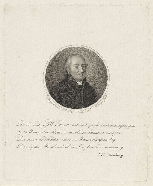 Editor: This is a portrait of Johannes Jacobus Metelerkamp, made between 1789 and 1822 by Jan Willem Caspari. It's a print – an engraving, to be precise – and something about the direct gaze makes me curious. What do you see in this piece? Curator: Well, beyond the immediate likeness, I see a reflection of the complex relationship between religious authority and social power. Consider the historical context: the late 18th and early 19th centuries were a time of immense social upheaval and the questioning of traditional hierarchies. Metelerkamp, as a Doctor of Theology and a preacher, embodies that establishment. How does his depiction potentially reinforce or subvert the existing social order? Editor: I see what you mean. It feels like the artist both respects and questions the power he holds, right? The portrait captures his position, but does it offer commentary, too? Curator: Exactly! And the choice of engraving as a medium is crucial. Prints, unlike unique paintings, allowed for wider distribution, meaning images and ideologies could circulate more freely among different social classes. Do you think the accessibility of this artwork affects our understanding of Metelerkamp's influence? Editor: Absolutely. If this was widely circulated, it made Metelerkamp more accessible to the people he served, maybe even those he governed spiritually. It puts his image directly in their hands. Curator: Precisely. And the controlled line work of the engraving, that almost austere visual language, what does that say about the values of the time? About the construction of masculinity, perhaps, and the representation of religious figures? Editor: It's fascinating how much historical and social weight a single image can carry. Looking at this, I’m thinking about the subtle ways power is represented, reinforced, and potentially challenged. Curator: It's a conversation starter, right? Art encourages us to question, analyze, and connect to these histories, and it resonates even today.