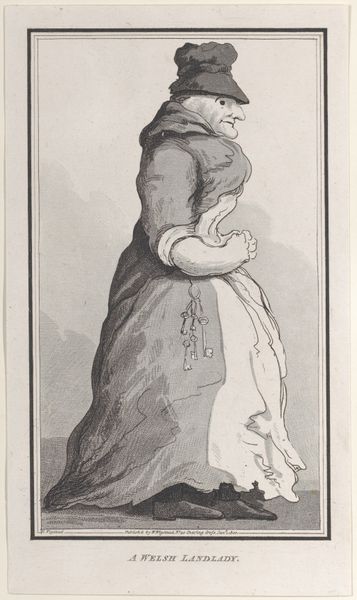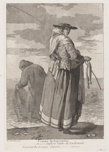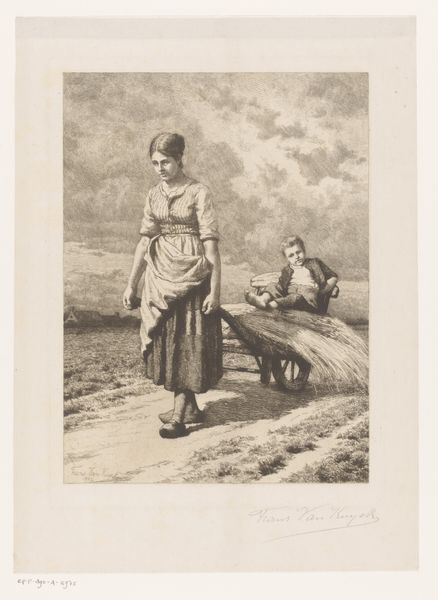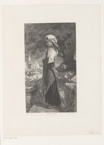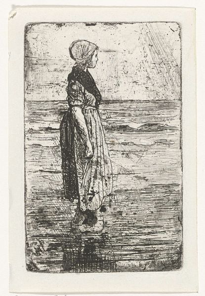 Karel Frederik Bombled made this etching of a standing woman with a riding crop, but we don't know exactly when. Looking closely, you can see the intricate network of lines that bring the figure to life. This is achieved through etching – a printmaking process where lines are incised into a metal plate using acid. The plate is then inked, and the ink held in these etched lines is transferred to paper under high pressure. What's interesting here is the effect that this process has on the image. The woman and the landscape melt together. This choice emphasizes the sitter's connection to the outdoors, to the earth itself. Though this seems like a simple scene, it represents a huge amount of labor, from the mining and processing of the metal plate, to the skilled work of etching. The finished print, ultimately, is a physical record of all this human effort. Seeing the work this way, it reminds us that even seemingly simple images have a complex story to tell.