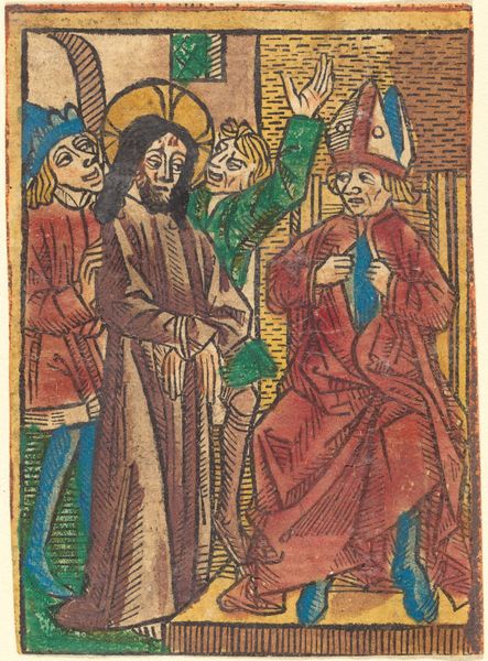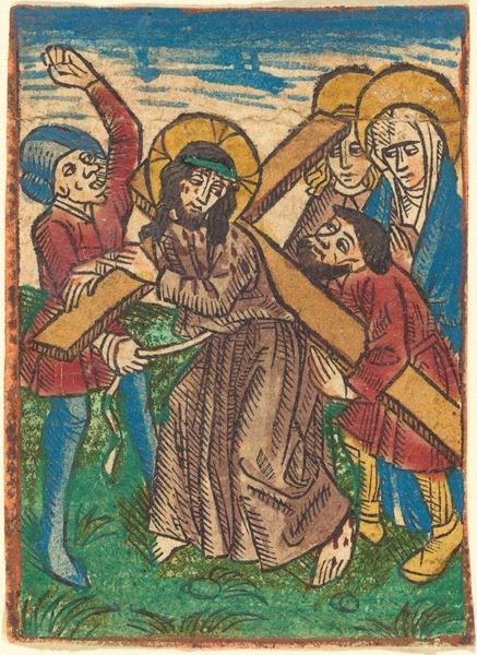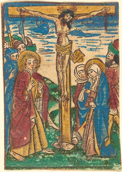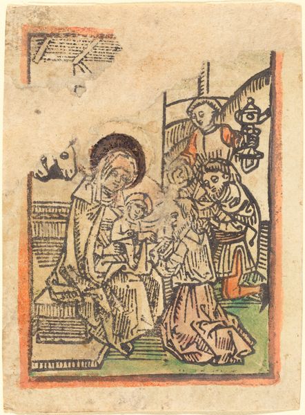 Editor: This woodcut print, "The Betrayal," dates back to the late 15th century. I’m immediately struck by how packed the composition is, almost claustrophobic. There’s a lot going on in a small space, figures crammed together. What are your thoughts on this depiction of such a pivotal moment in religious history? Curator: This woodcut, indeed, reflects a particular visual culture, showcasing how religious narratives were disseminated amongst the public. Notice the almost cartoonish style of representing drama. What impact might this image have had when it was made widely available as a small print, do you think? Editor: I imagine it made the story more accessible, less formal. Did the proliferation of images like this shift religious authority? Curator: Precisely. It allowed for a more personal engagement with biblical narratives outside the direct control of the church. The emotional intensity is palpable, even within the constraints of the medium. It's a far cry from grand church altarpieces, don’t you agree? Editor: Definitely, this feels much more… democratic, in a way. It seems almost made for individual contemplation. The fact that it’s reproducible also speaks to that democratization. It changes the whole power dynamic. Curator: Consider how this very act of reproduction and widespread dissemination of religious iconography arguably diminishes the singularity and preciousness formerly associated with these biblical representations. It brings up so many points on authorship, public perception, and the ever-changing cultural landscape. Editor: This has been so insightful. I never thought about a small woodcut holding so much cultural significance! Curator: Every artifact, no matter its size or intended purpose, participates in a complex web of historical forces and represents critical societal transformations.