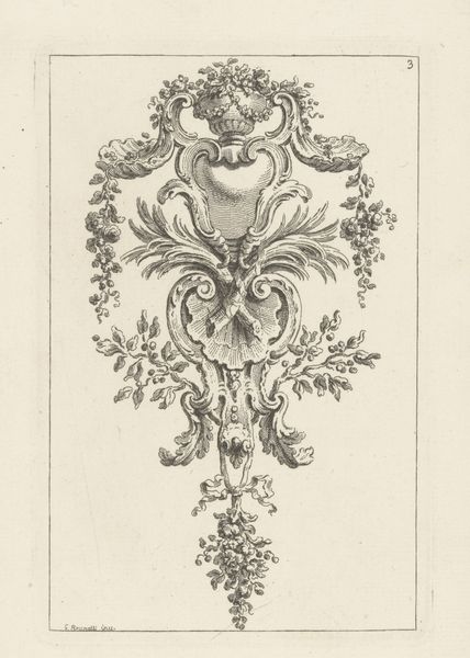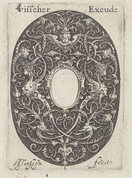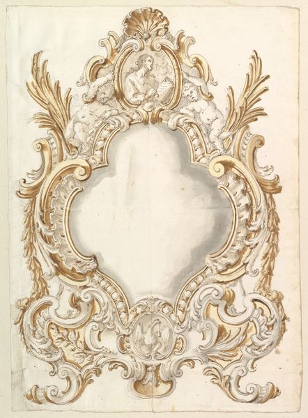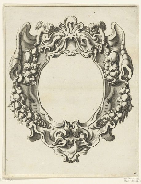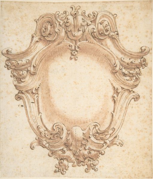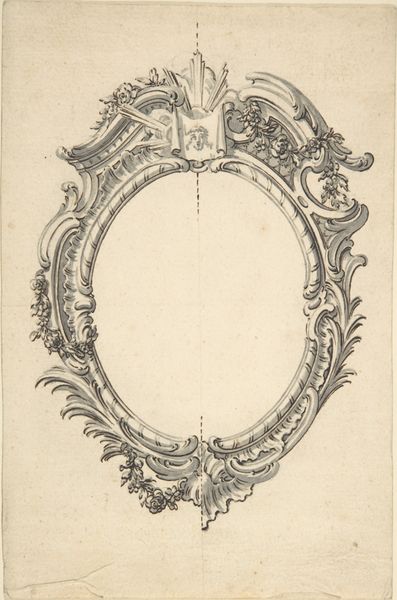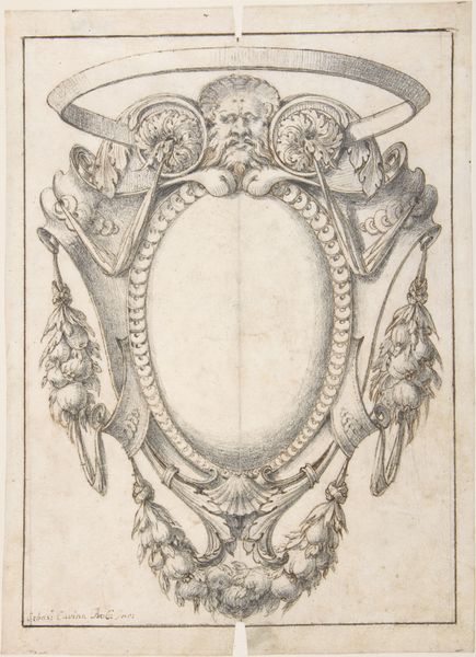 Curator: This work, dating to the late 18th century, is titled “Design for a Cartouche with Zoomorphic Mask above and Cornucopia of Fruit and Leaves on the Sides," created by Sebastiano Cavina. It's currently held at the Metropolitan Museum of Art. It’s a charcoal and pencil drawing—imagine the crisp lines the artist could achieve. Editor: Well, my initial impression is that it feels… empty. An elaborate frame for something that's missing. The grayness really accentuates the hollowness; the oval space yearns for a portrait, a scene, anything, to give it purpose. Curator: Absolutely, and the emptiness is intentional, part of its function as a design proposal, awaiting a patron’s desire and artistic interpretation. It embodies the Neoclassical aesthetic, the perfect symmetry, the idealized forms borrowed from antiquity, all designed to evoke balance, order. We need to see past its intended function as design and meet Cavina on his plane. The space is meant to spark new meaning from us! Editor: While technically proficient, doesn’t it reek a bit of that era’s hierarchical worldview? The cartouche itself, a frame of power and status… like art reduced to simply adorning wealth. I mean, that blank oval… Whose stories were *allowed* inside those frames back then? Were the voices of the working class even considered when rendering an ornamental frame such as this? Curator: That's a potent critique. And it's precisely those social dimensions we have to bring to the work. Though it may be intended for aristocratic display, the draftsmanship itself is impressive, maybe even challenging the elite by mastering their academic tradition! Imagine Cavina, making his own statement by reinterpreting old themes. What possibilities emerge in that light? The fruit is particularly engaging, with this near grotesque rendering of each, as if bursting forth at any given moment. Editor: Agreed, the artistry is undeniable. Perhaps it’s a call to examine who gets to create and be celebrated in art today. If we can’t, at the very least, be in active pursuit of equity for historically disenfranchised people, this Neoclassical period piece just functions as wallpaper for an elite society of oppressors. Curator: I’d like to think that maybe even then, beauty, even ornate, restrictive beauty, offered an echo of dissent. The idea of making old things new again; is there freedom to be had in that, at least? Editor: Maybe. But without actively acknowledging the legacy and systems behind such design, such forms remain tethered to an unequal past. Perhaps what needs to be centered within is not merely aesthetics, but radical questions surrounding our history.