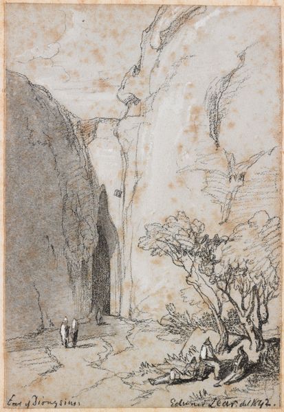 Editor: So, here we have "Capri," a 1913 drawing by Elihu Vedder, done with colored pencils. I’m struck by how this narrow path just pulls you in; it's like stepping into a half-remembered dream. What do you make of it? Curator: Ah, yes, "Capri." I imagine Vedder, stick in hand, wandering those sun-baked Italian lanes. He captures not just the place but the very *feeling* of Capri, wouldn’t you say? It is almost a sensory portrait, using mostly grey tones. Do you find it romantic in that sense? Editor: Absolutely! The limited palette adds to that feeling, it's understated but evocative. It also reminds me of a stage set… almost theatrical. Curator: I love that observation! Vedder certainly understood the drama of light and shadow, framing the scene so carefully. See how he directs our gaze right down that alley? A personal invitation, maybe? Or perhaps it's like walking through one’s own memory, layered with time. Do you feel a kind of contemplative nostalgia as you look at it? Editor: Definitely, it's bittersweet, almost melancholy. I am noticing now the subtle colors he uses in the sky. They make me want to know more. Curator: You are right on track! And consider, this was created relatively late in his life, so perhaps this lane embodies the paths of our life, full of mysteries, awaiting what's ahead! Editor: That is something I wouldn't have noticed, but that is what I will keep in mind. Thank you. Curator: My pleasure. Art speaks loudest when we listen closely, together.