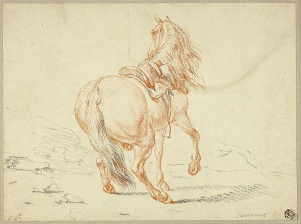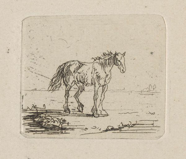 Johannes Tavenraat created this expressive pen drawing of a horse standing in a field. Tavenraat was working in the Netherlands during a time of significant social and political change. His art reflects a deep connection to the Dutch landscape and rural life. This drawing, with its solitary horse, invites contemplation about our relationship to the natural world. The horse, a traditional symbol of strength and freedom, is rendered here with a sense of quiet vulnerability. Consider how Tavenraat’s choice to depict the horse alone in a field shapes our understanding of both the animal and the landscape. Does it evoke a sense of melancholy, or does it invite a more profound reflection on the place of nature in an increasingly industrialized world? The simplicity and directness of the drawing allow for an intimate encounter with the subject, inviting us to consider the emotional lives of animals and our ethical responsibilities towards them.