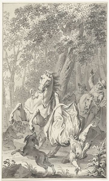This engraving by Reinier Vinkeles captures a dramatic moment: Maria van Bourgondië's fall from her horse in 1482. The scene unfolds with a theatrical intensity, underscored by the surrounding forest, a traditional space of danger and the unexpected. Consider the rearing horse, a symbol of untamed power, now ironically contributing to the tragedy. This motif echoes through art history, from classical depictions of warfare to Renaissance allegories of fortune's fickleness. Here, the horse is not a noble steed but an agent of fate. The dog, bounding forward, is a symbol of loyalty and protection, yet it can do nothing to avert the fall. This poignant juxtaposition reminds us of the limitations of even the most faithful companions in the face of destiny. The way the figures reach out in desperation speaks to a primal fear of loss of control, a shared human experience that transcends time. The emotional charge of this image lies in its stark portrayal of vulnerability, a theme that continues to resonate across centuries and cultures.
