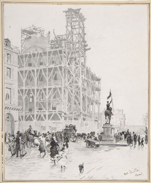 Muirhead Bone made this print called 'Building' with etching, and the process is everything here. Look closely and you can almost feel the scrape of the etching needle. The whole image pulses with these marks, dense and dark, especially around the skeletal structure dominating the scene. Each line isn’t just describing a beam or a worker; it’s got its own energy. The light here is amazing, he lets the open paper breathe, creating this smoky, atmospheric haze. Check out how Bone uses these dark masses of lines to build up the scaffolding versus the details of the figures below, or the buildings in the background, sketched more lightly. It's like he's composing with texture, not just shapes. It reminds me a little of Piranesi's architectural fantasies. Ultimately this feels like a celebration of labor, or maybe just an ode to the beauty of things being made, unfinished, raw. It makes you wonder, what's the building going to become? Does it even matter?