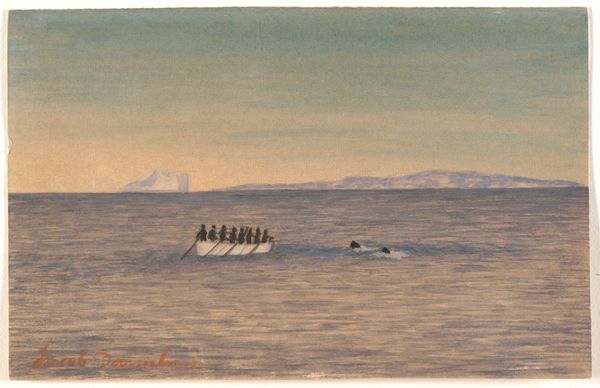 Curator: What a wonderfully evocative piece. This is an untitled drawing by Jakob Danielsen, likely created sometime between 1928 and 1938. The primary mediums appear to be watercolor and coloured pencil. It resides here at the SMK, Statens Museum for Kunst. Editor: It strikes me as desolate, and expansive. The pale, almost bleached colors contribute to this feeling of stark isolation, almost like a dreamscape on the verge of fading away. The horizontal composition accentuates the breadth of the ocean, dividing the work nearly in half by sea and sky. Curator: Precisely! The subtle gradations within the watercolor wash create a mesmerizing effect on the water's surface, broken only by a stark, horizontal line separating the ocean from the sky, adding to its austere character. What do you read from the boat's position relative to the horizon and the…creature? Editor: The small boat with figures huddled together really amplifies the sense of human vulnerability. They’re dwarfed not only by the whale—its presence immediately suggesting the sublime and potentially destructive force of nature—but also by the monolithic icebergs in the distance. Icebergs are never simply geologic, of course; in the cultural imagination they stand for the looming and often invisible threat. Curator: Very insightful! Notice how Danielsen uses the limited color palette to great effect here; a play between soft peach above and a subdued slate blue dominating below. How might we understand the relationship between the boat and the whale formally? Editor: There is a real tension inherent in the small, active rowboat juxtaposed with the massive, largely submerged whale. The hunters seek sustenance, yet face the overwhelming scale of the natural world, calling into question their relative dominance. Curator: Absolutely. Furthermore, observe the artist's application of pigments – the texture achieved via layering which is, quite compelling considering the nature of watercolour drawing. There is evidence also of realism at play in his landscapes, which he executed throughout his career, including during his time as a catechist. Editor: I find myself moved by its quiet dignity. It encapsulates a complex dance between man and nature, and the enduring power of symbolic landscapes. The entire picture reminds us of nature's sublime force against the fleeting human endeavors. Curator: Indeed; a remarkable exploration of spatial relations through modest materials. Danielsen achieves a tremendous amount of affect with a muted palette.