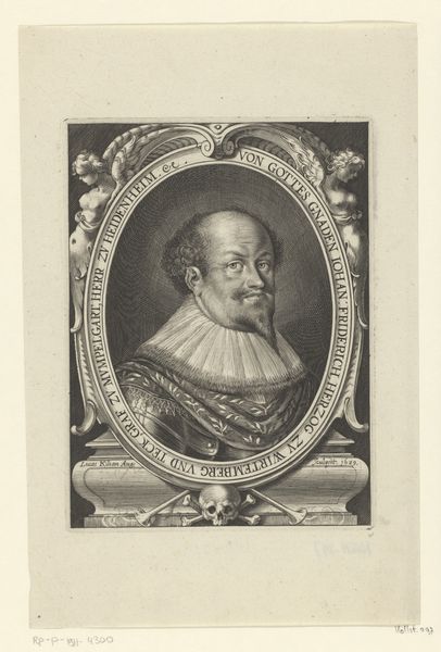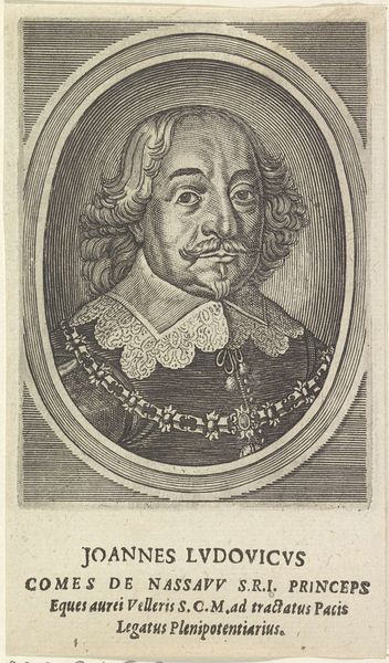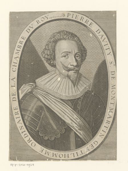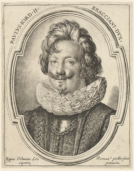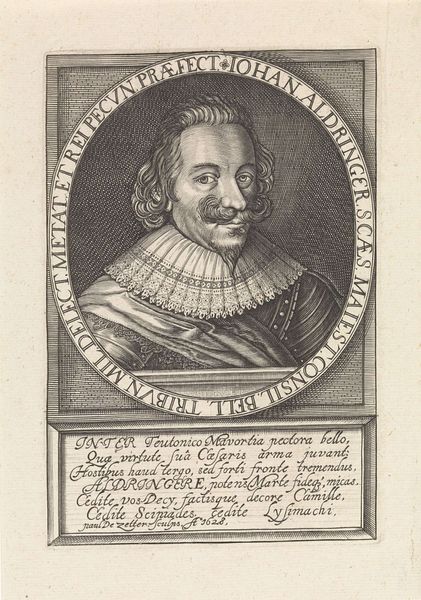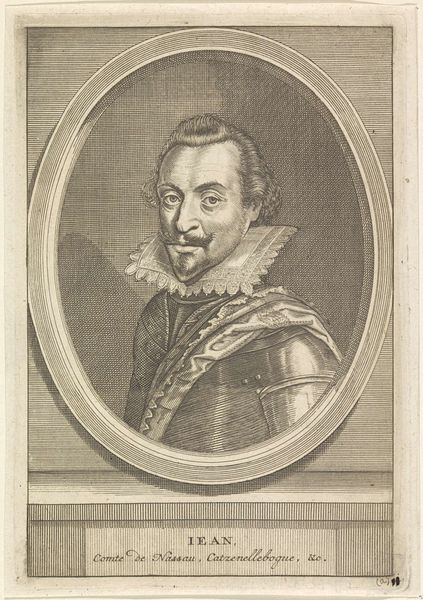 Curator: This engraving is titled "Portret van Wilhelm Salentin von Salm-Reifferscheidt," created sometime between 1590 and 1634 by Jacob van der Heyden. Editor: The texture created in the armor and lace is quite compelling. I imagine the production required some talent. The stark contrast evokes a sense of formality but with the eyes peering out it does feel a bit haunting, doesn't it? Curator: The textural elements are fascinating here. It is critical to consider the techniques necessary for production. This required meticulous work; each line on the copperplate needed precise cutting and it showcases skill, labour, and attention to detail. I wonder if any workshop assistants aided Jacob Van Der Heyden. Editor: And surrounding Wilhelm is all this circular text and that ornate heraldic crest. To me these act like protective emblems, markers of his status but also shields against an unknowable future. Curator: Precisely! The heraldry, as a symbolic element, demonstrates wealth, nobility, and ancestry—visual representations of economic and social status. I think the print, reproduced and disseminated, served the interests of class affirmation through material means. Editor: Yes! It solidifies lineage. But think, too, of the man himself. His slightly smug expression gives the entire scene a psychological layer of self-assuredness, as though daring us to question the symbolism surrounding him. I do find his moustache charming, although the Baroque style does seem a bit ridiculous. Curator: Perhaps he had it shaped that way to emphasize social position. Regardless, our discussion underscores how this artwork is a physical object, created and distributed within a specific cultural context, thus prompting meaningful inquiries. Editor: And by examining Wilhelm’s symbolic armor and heraldry, we decode layers of emotional depth and historical understanding of both class structure and familial identity.