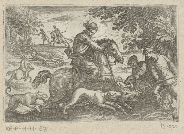 Editor: We’re looking at Giuseppe Scolari’s “The Rape of Proserpina,” an intaglio print made somewhere between 1592 and 1607. The frantic energy is immediately apparent! All those lines give such a sense of movement. What historical narratives or interpretations spring to your mind when you see this print? Curator: This work really captures the dynamism favored during the late Renaissance. Considering Scolari’s place within the art world of the period, it is essential to remember that printmaking held a significant role in disseminating imagery and influencing public perception of classical myths, but it also was an act of art reproduction that depended greatly on previous artwork. How do you think prints like this one shaped the broader cultural understanding of mythology during this period, especially when few could visit Rome and see similar sculptural work? Editor: So, was this a way to popularize high art themes for a wider audience, but removed by several degrees from the 'original'? Curator: Exactly! These prints were crucial for the democratization of visual culture, allowing even those without access to elite circles to engage with classical themes, although with some mediation. Scolari is translating powerful narratives of abduction, power, and submission into readily accessible imagery. How does the print medium itself—the stark contrast of black ink on paper—contribute to the drama of the scene, versus seeing it, say, rendered in paint or sculpted? Editor: Well, that sharp contrast definitely amplifies the violence, doesn't it? And the starkness arguably makes the figures feel isolated. This really underscores how artistic choices intersect with historical contexts to shape our understanding of a story. Curator: Precisely! Thinking about prints like these gives us so much insight into art’s role within broader socio-political frameworks and into whose voices were amplified, or perhaps subtly altered, in the process of artistic and cultural reproduction. Editor: That really opens up new ways to look at it. Thank you!