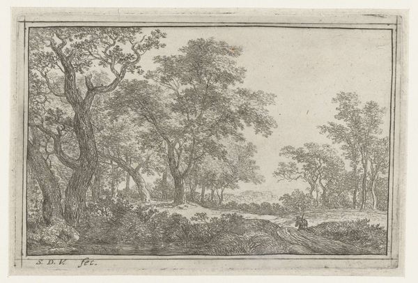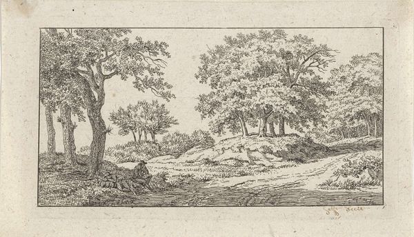 Johan Christiaan Willem Safft made this print, Two Resting Figures Beside a Forest Path, using etching techniques sometime in the late 18th or early 19th century. It presents a serene woodland scene, encapsulating the romanticism prevalent in Dutch art of that period. But it's also possible to interpret it as a commentary on the changing social landscape. The resting figures might represent the working class finding solace in nature, away from the industrialized urban centers. Dutch society was undergoing significant economic and social changes, and art often served as a means to reflect upon these transformations. The institutional history of art at this time reveals a growing interest in landscape painting, which was seen as a way to celebrate national identity and the beauty of the natural world. By delving into period literature, economic records, and the biographies of artists like Safft, we gain a richer understanding of the cultural values reflected in this seemingly simple artwork.