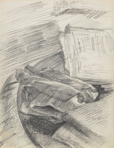 Editor: Here we have "Hallstand, detail," a pencil and graphite drawing by James Ensor. The sketch feels really raw and unfinished to me. The cross-hatching creates a lot of dark shadows, but it's also hard to make out the specific forms. What strikes you about this work? Curator: Well, for me, it's like peering into Ensor's mind at a fleeting moment, an intimate observation sketched out quickly. The hallstand is not just an object, but a container of untold stories, wouldn’t you agree? Look how he captures light – not perfectly, not realistically, but with such an emotive scratchiness. Do you feel that almost anxious energy in those lines? Editor: Absolutely! The scratchiness really emphasizes that energy. I see what you mean about the light. Curator: I’ve always found his approach incredibly personal. The skewed perspectives, the almost obsessive detail in certain areas contrasted with vague expanses, it tells us more about *how* he sees than *what* he sees. It’s like he’s asking us, "What do *you* see reflected in this fragmented reality?" It is as though this utilitarian piece of furniture is an apparition of itself. Editor: That's a great point! So, the unfinished quality actually pushes us to engage more deeply with it, filling in the gaps ourselves? Curator: Precisely. The act of viewing becomes participatory, imaginative. Ensor gifts us this beautiful incompleteness, knowing that art’s power lies not just in its presentation, but in its resonance within the observer’s own experiences. It's almost like Ensor is winking at us. Editor: That makes me appreciate it in a completely different light, pun intended. I guess it's not really about the hallstand at all. Curator: No, my friend. It is about *you.* Art mirroring art and inviting our humanity. Editor: This was really helpful! Thank you so much. Curator: The pleasure was all mine. The more we search the world of Art, the more of ourselves we learn!