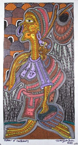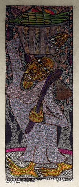 Curator: Twins Seven Seven's "Village Life Under the Cocoa Tree," from 2007—what a tapestry of textures! The orange border positively vibrates against the figures. It just pulses with... well, tell me what it sparks in you. Editor: There’s an immediate sense of labor and community. I'm struck by how the dense patterning creates a collective experience but the faces feel quite isolated within that context. Curator: Isolated, yet linked by those incredible eyes! Look how they observe in multiple directions—seeing past, present, and perhaps even future realities, dreams mingling with toil. Twins Seven Seven uses mixed media on paper—paint, textile, and ink—a literal layering of realities. What’s not immediately obvious is how rooted this is in Yoruba mythology. He wasn't just painting scenes, but invoking spirits and histories. Editor: Absolutely, and it's precisely that layering which gives rise to a really compelling dialogue around exploitation. I can't help but see parallels with contemporary issues around fair trade and the cocoa industry’s neo-colonial structures where the global North profits disproportionately. Curator: You see a dissonance where I perceive symbiosis, the push-and-pull of communal survival mirrored in those vibrant colours and crowded forms. Maybe it’s both. The leaning figure holding a rod almost looks to be pleading. Perhaps it's with the earth itself to share its wealth, you know? Editor: Yes, a complex blend of hope and struggle… but a potent commentary all the same. Look at the composition as an argument rather than a simple reflection. Curator: Perhaps we’re both right. It has that evocative power doesn’t it, to suggest without dictating? I walk away wondering what those figures would say if I could truly listen. Editor: And what would a truly decolonized trade system look like if the land and people themselves were allowed to lead? Powerful piece.