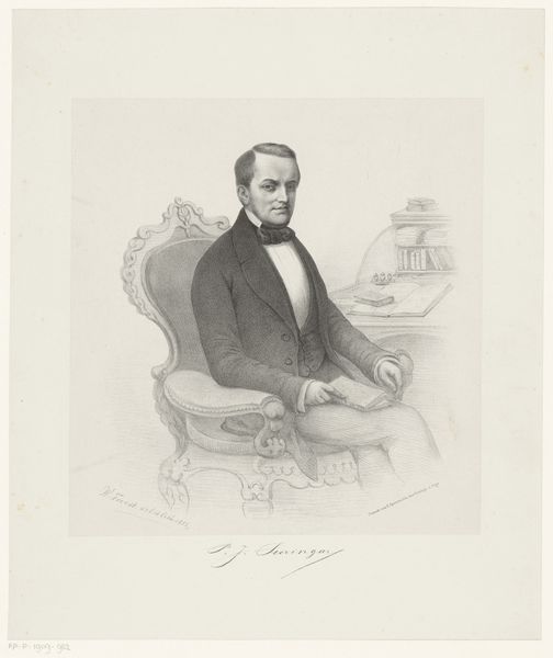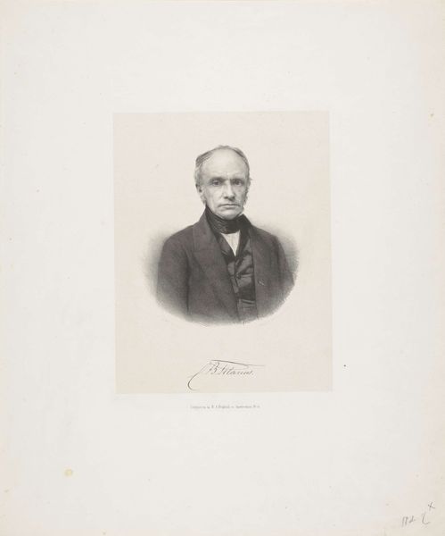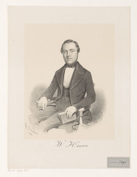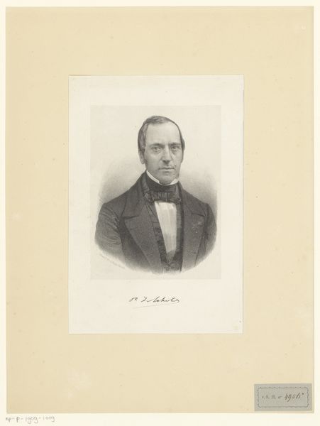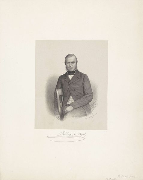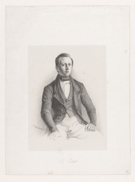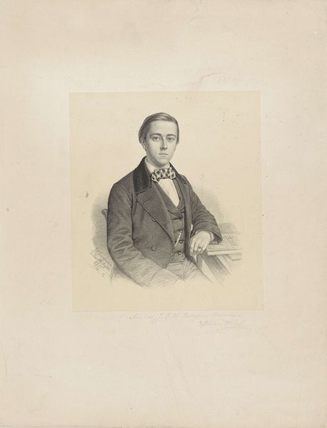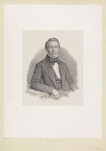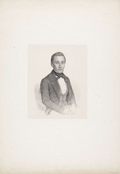 Editor: So this is a portrait of C.D. Canne, possibly from 1847, by Johann Peter Berghaus. It's a pencil drawing, quite formal. The lines are so controlled, almost rigid. What stands out to you? Curator: I am immediately drawn to the tonal range Berghaus achieves with simple pencil strokes. Note the contrast between the crisp delineation of the figure and the soft hatching that creates the subtle gradations of light and shadow. It models form so realistically, and speaks to Canne’s social position, without embellishment. Consider how this visual contrast creates a captivating, realistic likeness. Editor: That's true, the light does define the subject. So, by focusing on form and technique, are you suggesting we can understand the artist's intent without looking for external meanings? Curator: Precisely. Look at the way the artist uses line and value to define the planes of the face. Notice how the textures of fabric in the waistcoat and jacket, with the contrast of the bow-tie fabric are distinct and precisely rendered through the pencil work alone. Isn't that remarkable enough? The focus remains on the artist's skillful manipulation of form and the visual interplay between elements. Editor: I see what you mean. It’s almost like Berghaus is demonstrating the sheer potential of the medium itself, how much realism is achievable through close observation and controlled marks. Curator: Indeed. By appreciating the artistic decisions regarding line, value, and composition, one can see beyond the mere subject matter, recognizing the drawing as a self-contained aesthetic statement. The subtle details draw one's attention and invite contemplation, fostering an appreciation for its own intrinsic value. Editor: Okay, that gives me a whole new way of seeing portraits! I will pay much closer attention to the marks in each work, instead of relying on external details alone. Thanks!